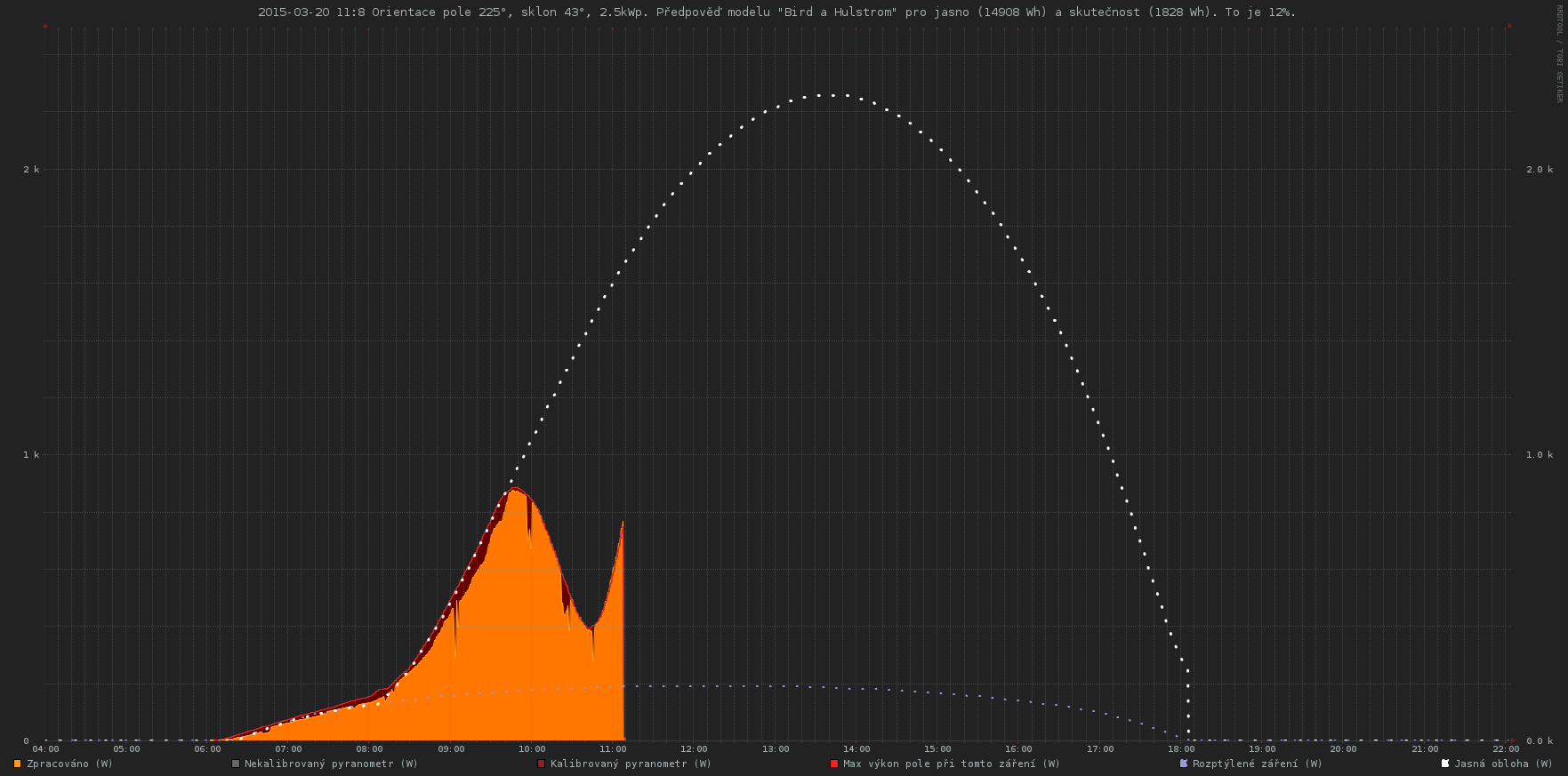 Graf pyranometru (červená křivka). Oranžová je co se mi z toho podařilo "vyždímat" na výstupu soláru.