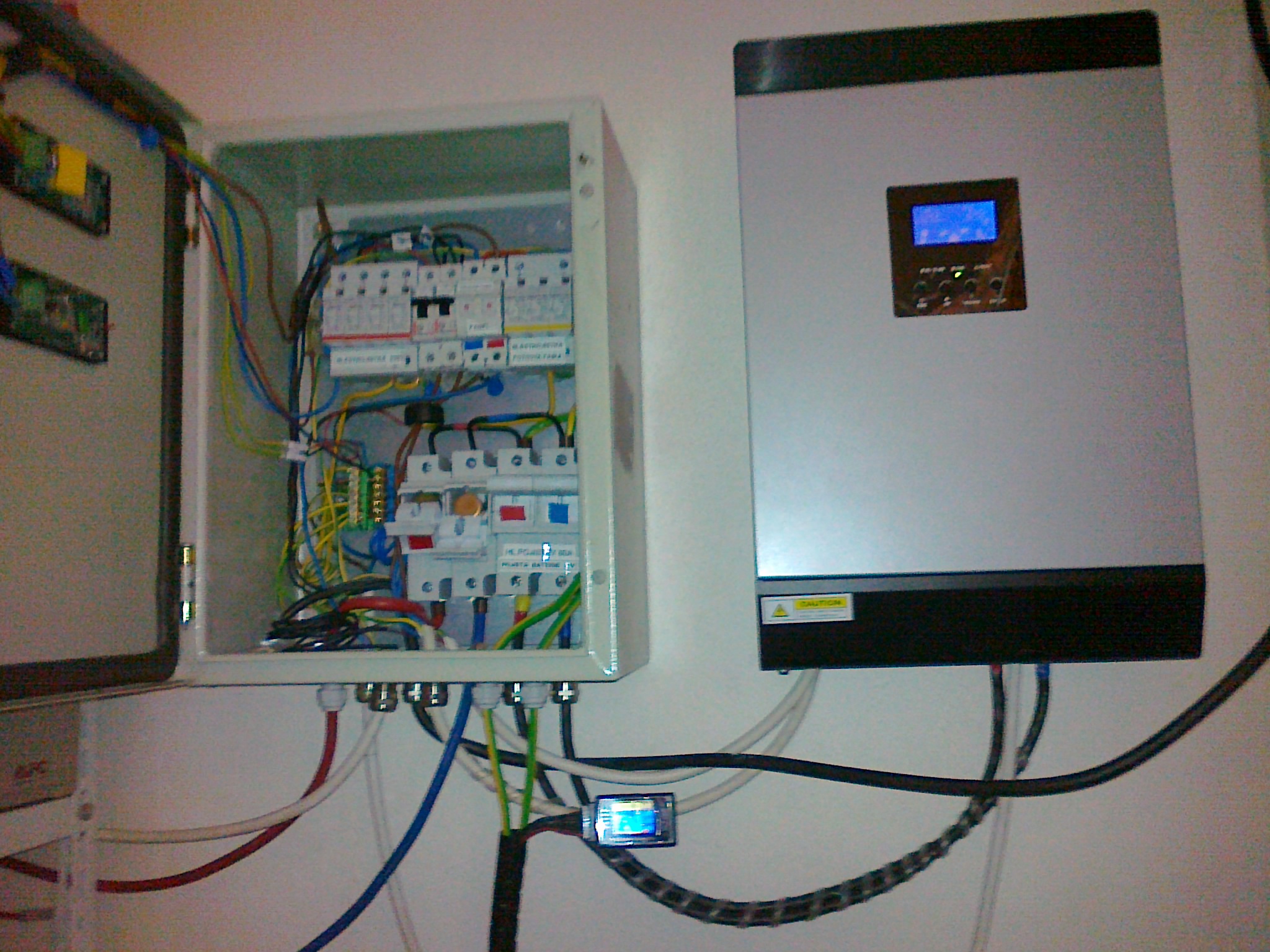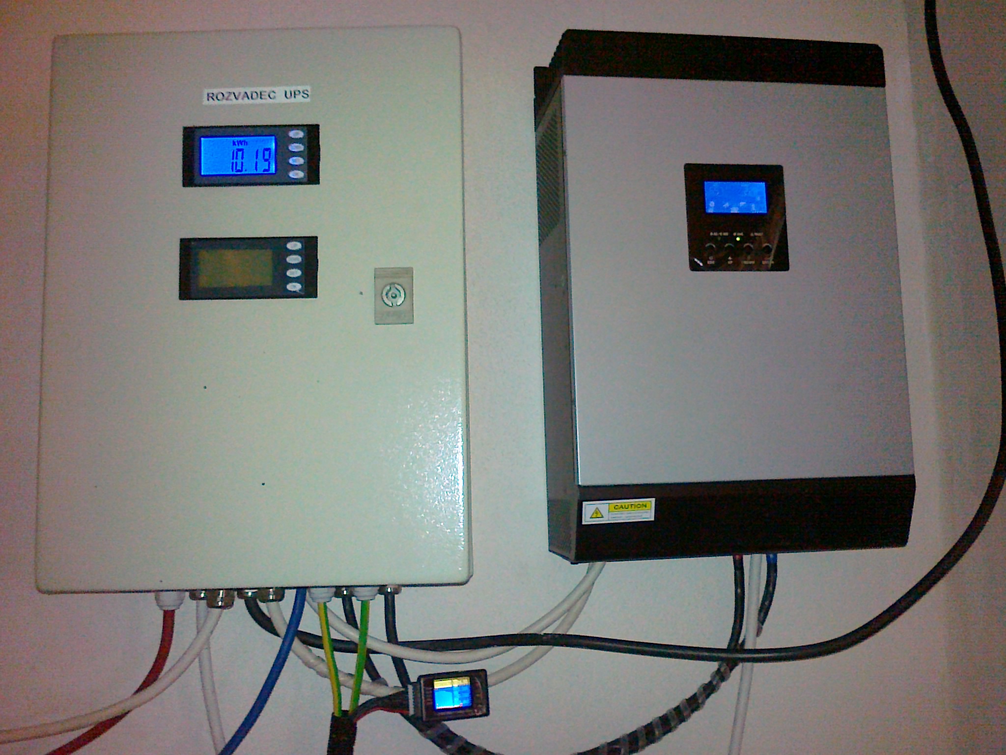 Baterie je 8x Winston 400Ah, která má už za zenitem a proto k některým článkům přidávám další, menší na doplnění kapacity. Balancery nepoužívám, jednou za půl roku při servisu vybalancuji manuálně. Napětí článků hlídá monitor s alarmem. AC rozvod je jednoduchý. Používám manuální přepínač 1-0-2 na odstavení měniče. Spotřebiče jsou v domě rozděleny na napájené z DS (čerpadlo vody, cirkulárka, sporák, pračka a rychlovarka) a na solární okruh, kde je vše ostatní pověšené na jedné fázi. Průměrná spotřeba domácnosti ve večerních hodinách je 500W. Zapojení jsem si dělal sám, cena komponentů zhruba okolo 100kKč, návratnost nepočítám, baví mě to.