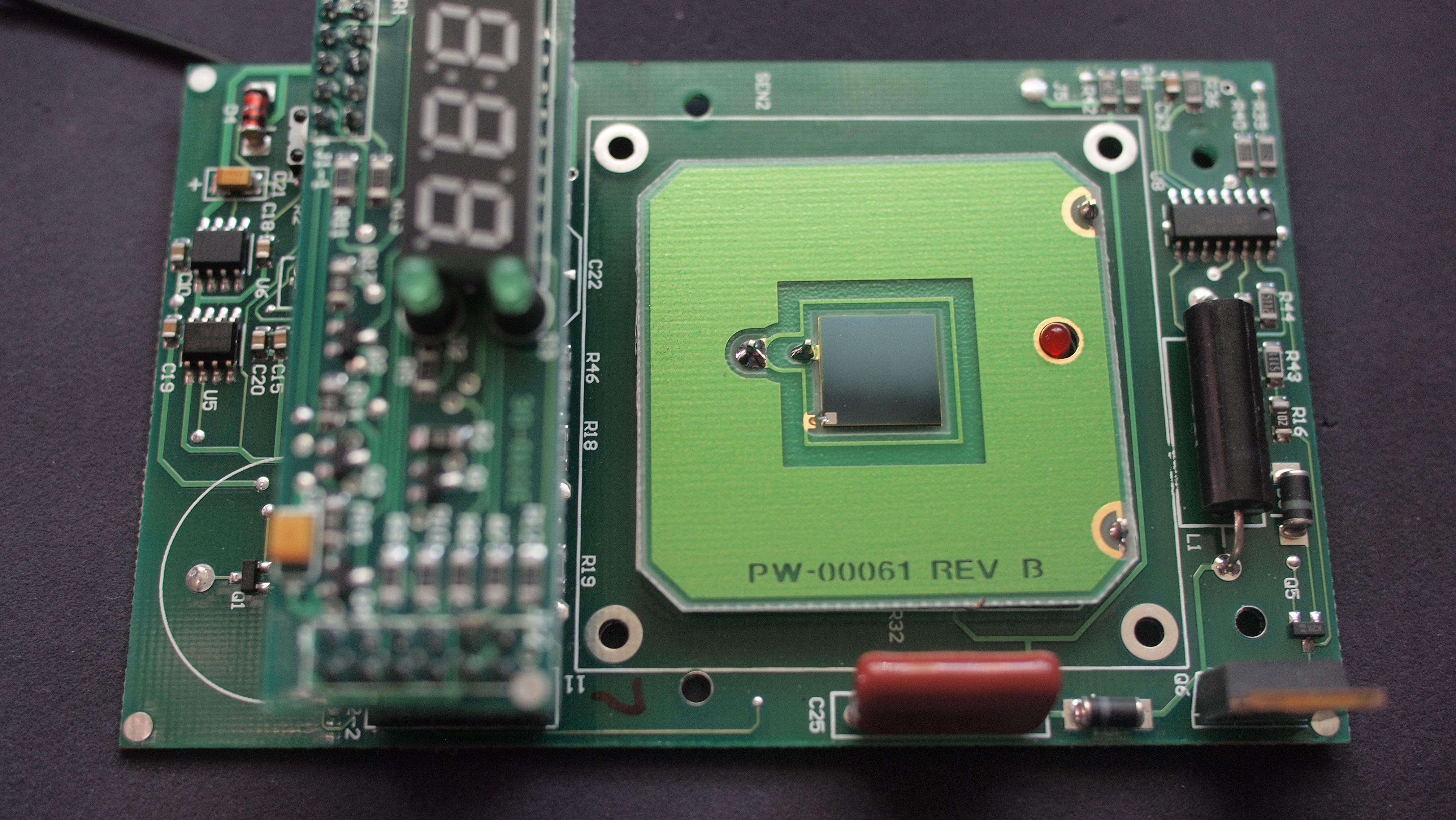 Mám i podezření, že je uvedený měřič špatně navržený. Je tam použito elektrostatické směrování alfa záření směrem k PIN diodě. Tedy celá komora (která na fotce není vidět, pouze čáry na desce ukazují, kam se šroubuje) je nabitá kladně a zelená plocha okolo PIN záporně. Protože alfy jsou vlastně kationty helia, přitahuje je záporně nabitá strana komory. To ale způsobí, že téměř všechny skončí na záporně nabitém zeleném tišťáku okolo PIN diody a na diodu v podstatě dopadnou jen nedopatřením. Takže by se asi funkce tohohle měřiče dala dost vylepšit. Protože je ale kalibrovaný, radši se do něj nevrtám, abych měl alespoň nejaký základ pro měření.