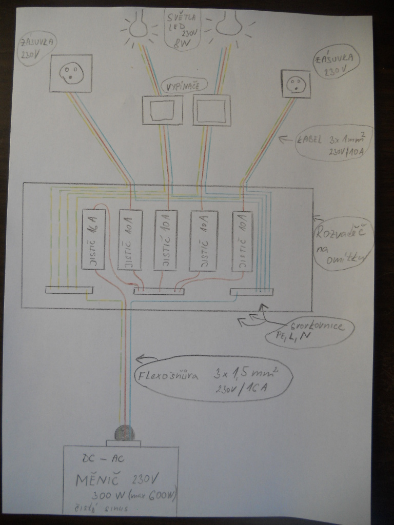 A pokud plánuješ časem silnější jistič. Šel bych od měniče drátem 2,5mm. K zásuvkám 1,5mm místo 1mm a světla máš jaké, že tam táhneš vodič PE? Ke světlům by mělo stačit třeba 2x0,5mm.