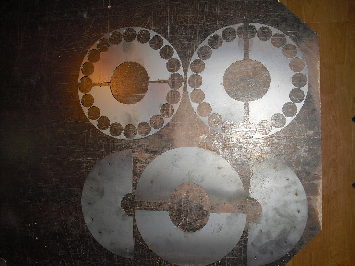 Prumer 280 mm,18 otvoru prum.5,1 mm pro upevneni civek, 20 otvoru prum.35,8 mm pro magnety,material ocel tl.3 mm,vyztuha bez otvoru ocel tl.2 mm. Cena za sadu na fotografii 500,-Kc.