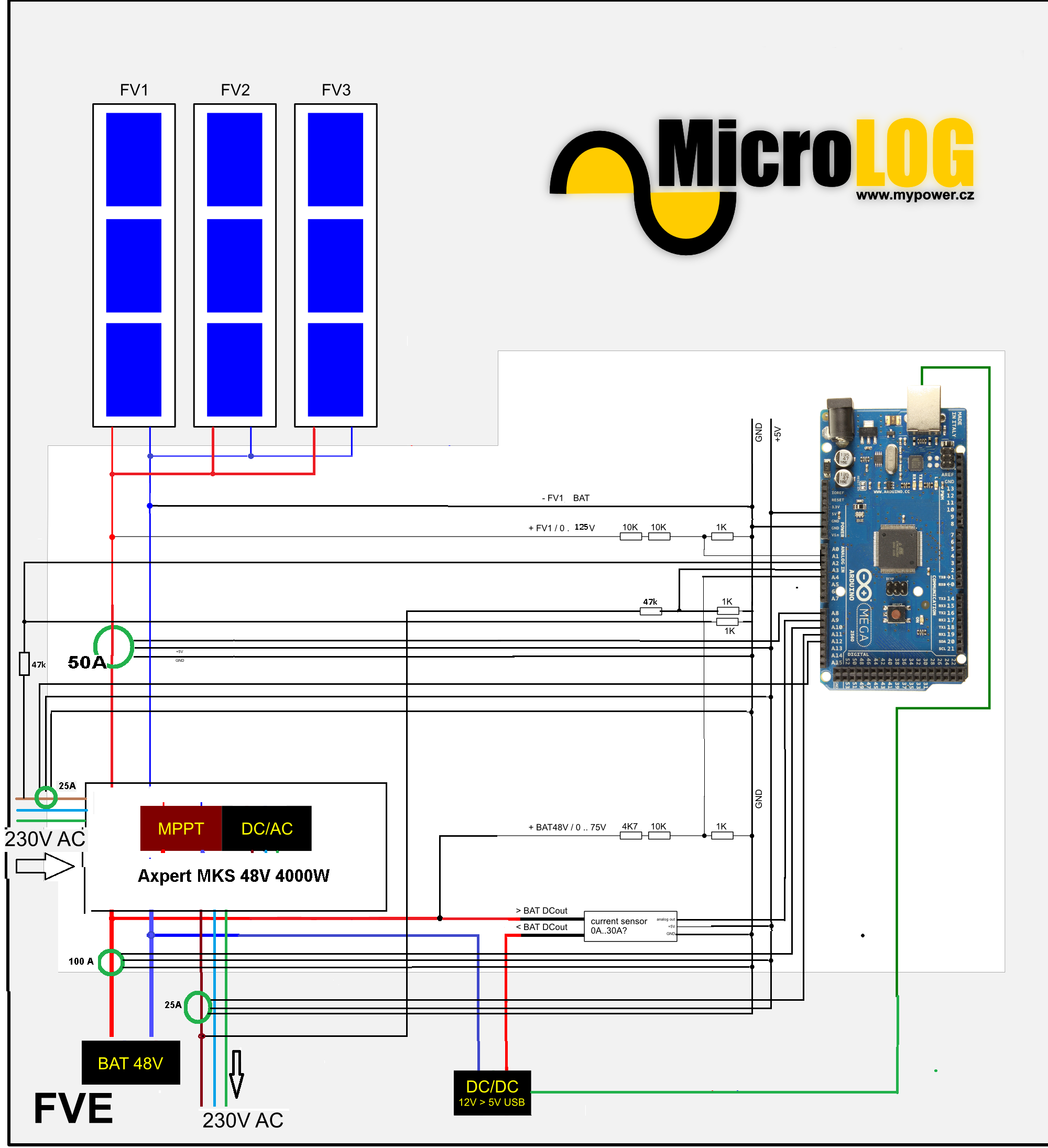 Diskuze se věnuje zapojení měření elektrických veličin u fotovoltaických systémů a jejich propojení s Mikrologem a Arduinem. Uživatelé sdílejí zkušenosti s výběrem čidel, správným zapojením a ochranou vstupů, aby bylo možné spolehlivě sledovat stav systému a přepínání mezi sítí a měničem. Součástí jsou i doporučení na vhodné komponenty a způsoby měření napětí a proudu.