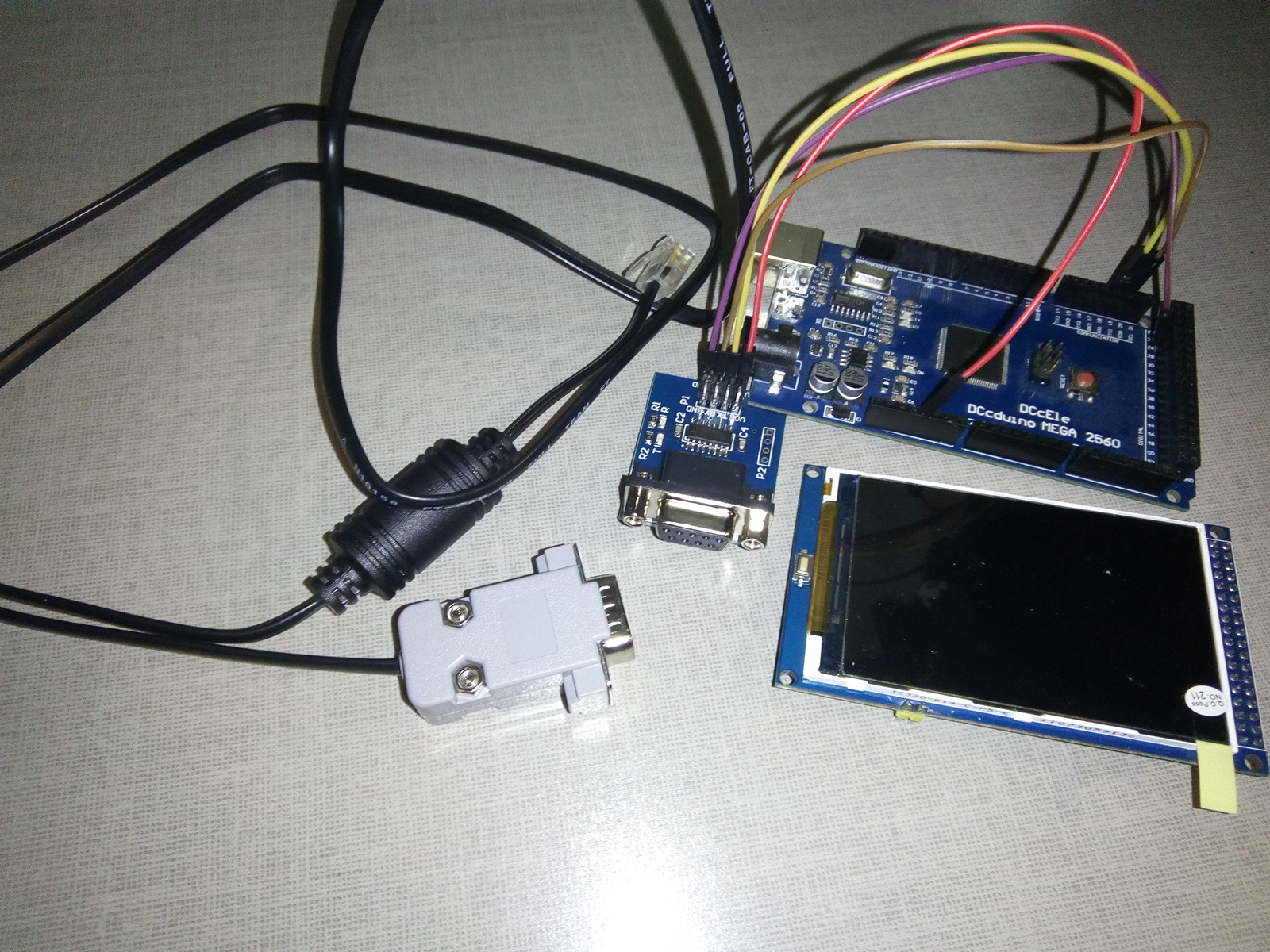 Investice cca 600 Kč, mega2560 + LCD 420 x 380 z Číny dohromady za cca 500, převodník RS232 x TTL, kabel canon 9 samec - RJ11.