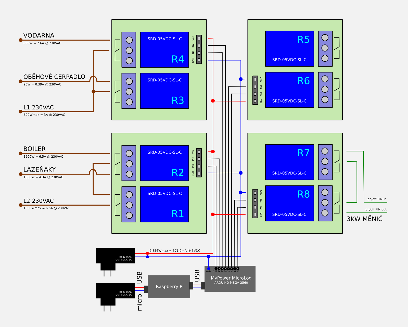 Premyslel jsem a nejsem si jisty, jestli nespojit i ty plusy tech zdroju, ale co tim ziskam, a co se muze stat kdyz spojene nebudou? Zem musim spojit minimalne, aby ty signaly pro rizeni rele z digitalnich pinu arduina mely uzavreny obvod, protoze GND je spolecna u rele jak pro obvod civky, tak pro signal pro rizeni. To spojene plus by znamenalo asi 2A na 5V ale otazka .. jestli to tem zdrojum bude sedet a nebudou se nejak mlatit... nevim .. bylo by to taky obejiti regulace na USB z raspberry do arduina.