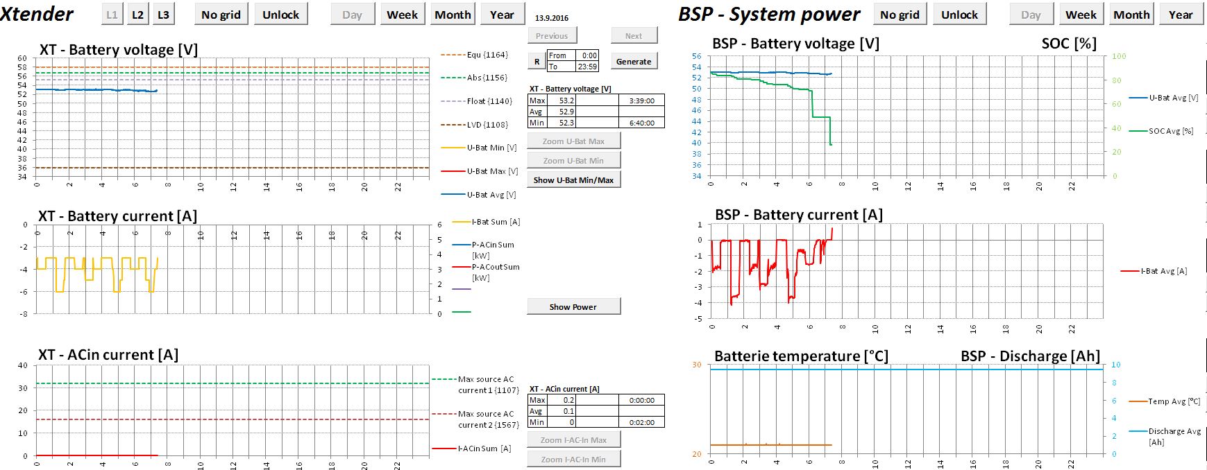 Môžem potvrdiť, že 4 kW Studer bohate stačí. Ak je prifázovaný k sieti. Ja som to ale takto nechcel, lebo minimálny odber 30-40 W ktorý vtedy zo siete odoberá, sa mi zdal zbytočný a trvalé vypnutie siete zas vyžaduje určitú disciplínu v zapínaní veľkých spotrebičov. Po tom, čo mi ho ženy dva krát zhodili som to vyriešil cez AUX1- programovateľné relé v Studeri. Teraz si sám pripne sieť ak výkon prekročí nastavenú hranicu alebo baterka klesne pod nastavené napätie. A všetci sú spokojní.Neuling16 píše:Mam aj online monitoring a nakolko som videl, ze niektori sa tu natahovali ohladom na tom, ci staci menic o vykone 4 kVa, tak zatial jednoznacne vravim ze ANO - staci. Ak by bol zaujem, velmi rad poskytnem data z monitoringu a statistiky z analysis toolu.