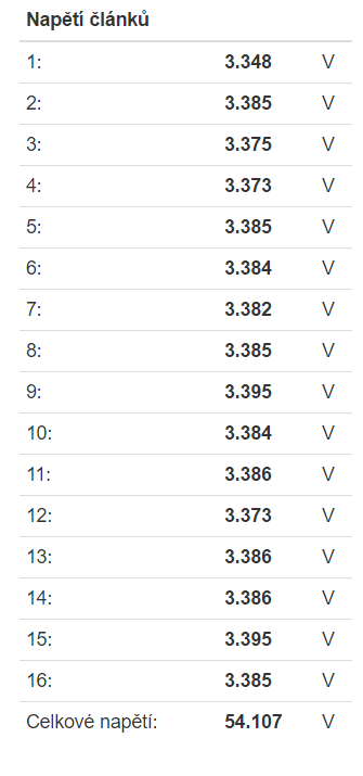 Já to mám takto.Nikdy všechny komponenty nebudou měřit stejně.Všechny měniče,střídače,by museli mít stejnou délku a průřez kabelů k baterii.Proto jsem si udělal vlastní měření článků.Pro kontrolu napětí jsem použil kalibrovaný měřící přístroj.Předtím jsem zkoušel klasické měřáky a každý ukázal jiné napětí.