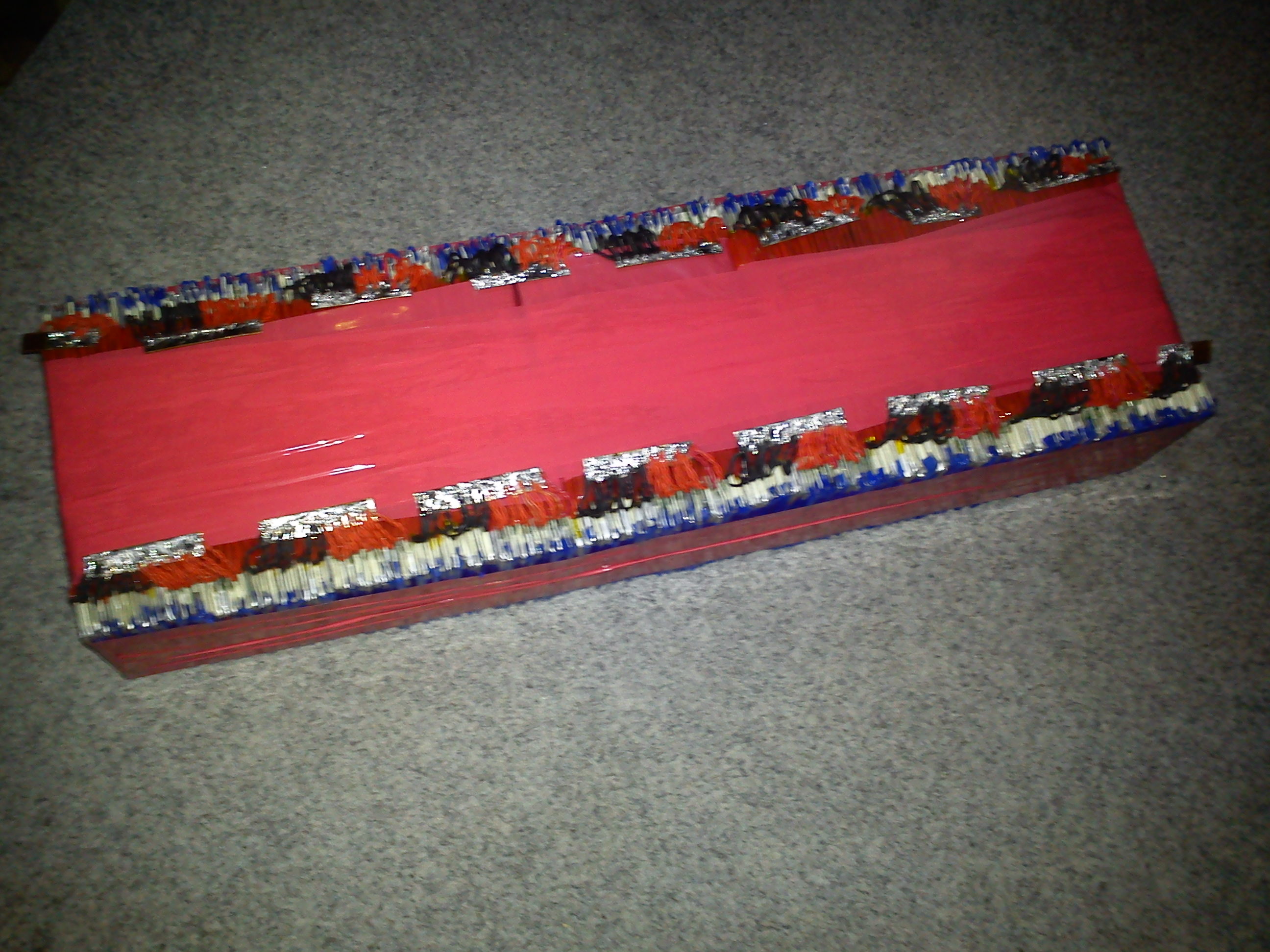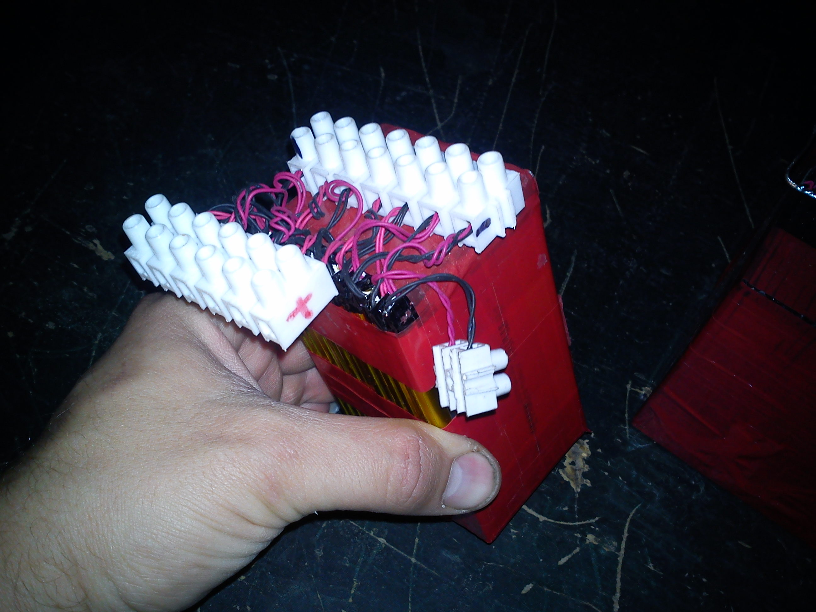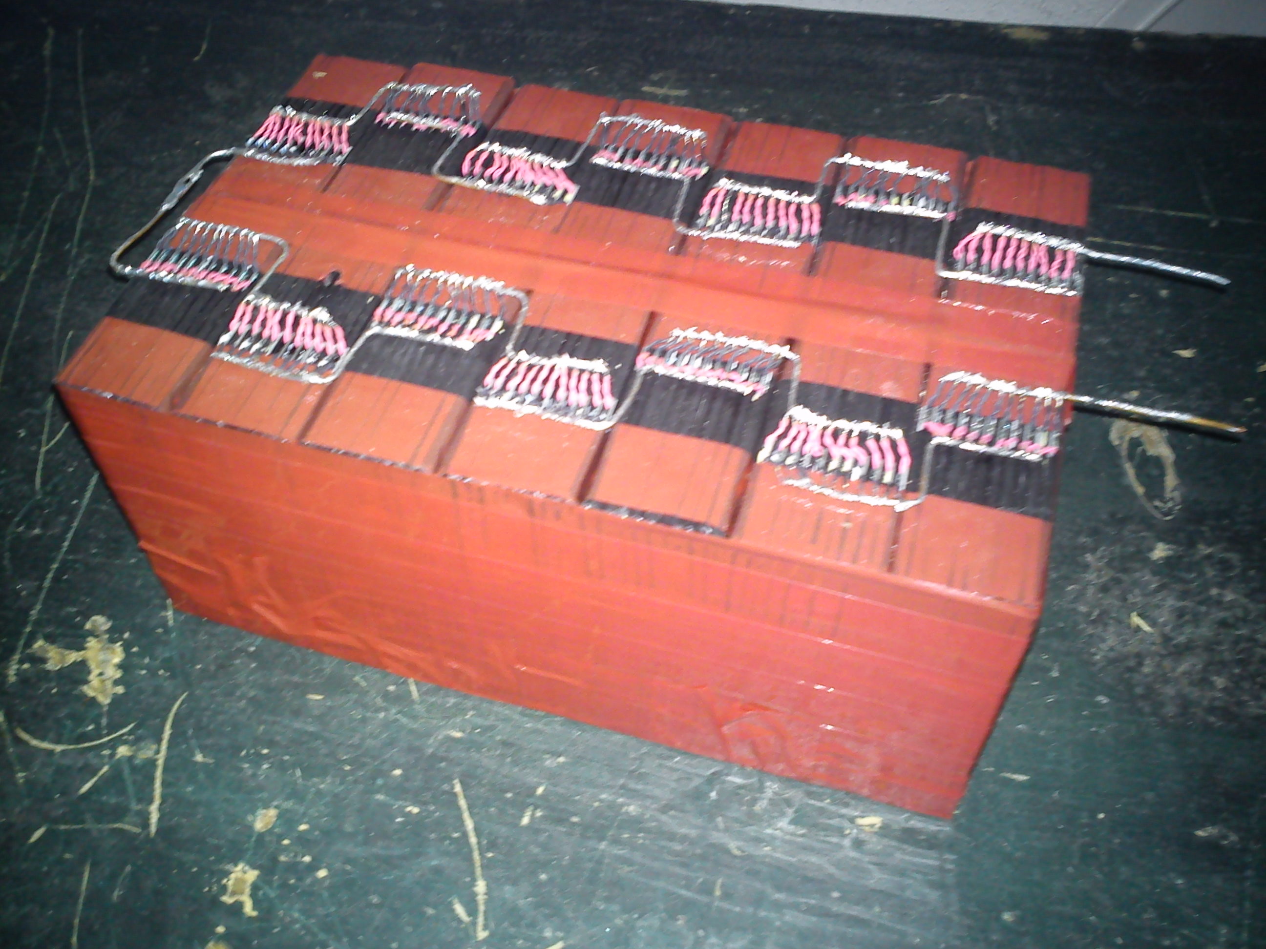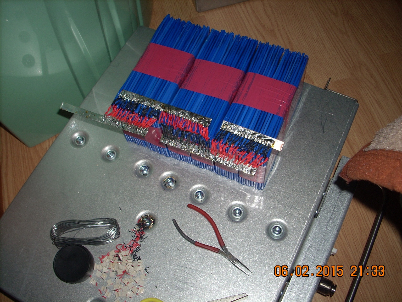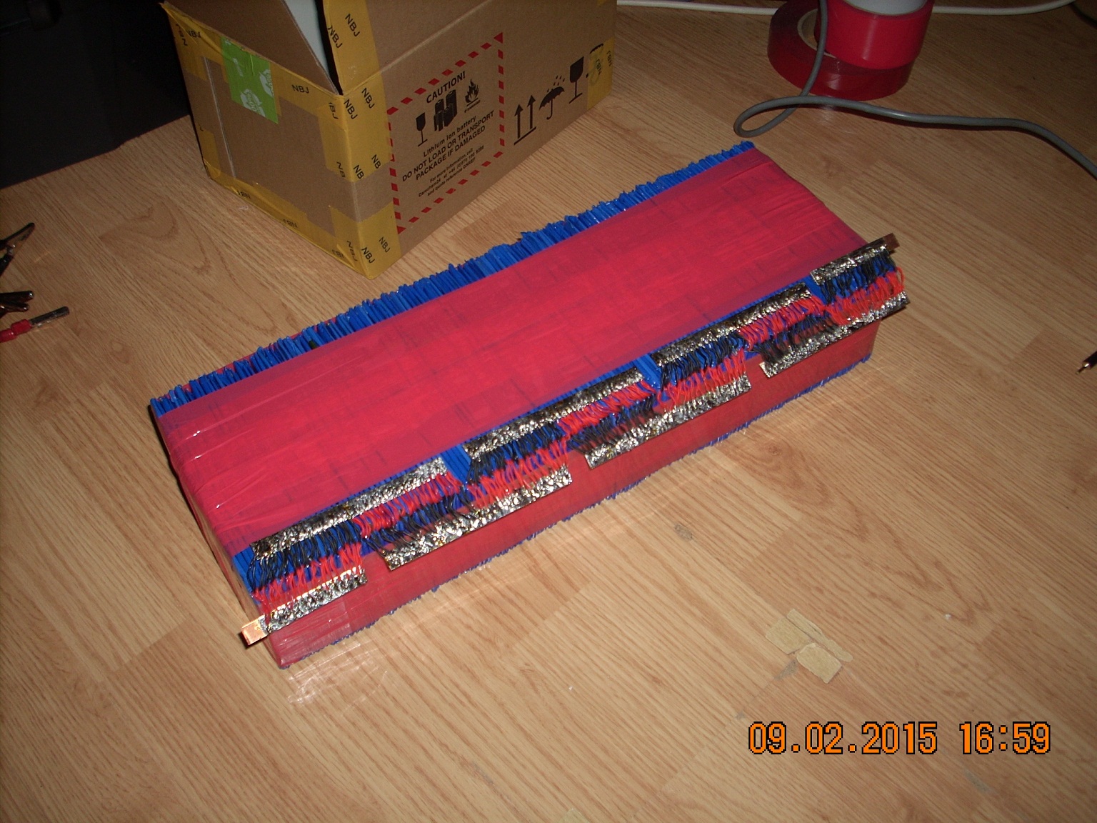 Potom už jenom spojuji články paralelně a sériově. U jedné mnou vyrobené baterie došlo k havárii když mi spadla a vlivem deformace došlo u jednoho článku k vnitřnímu zkratu. Během okamžiku došlo k přepálení jedné páskové výstupní elektrody. Považuji to za dostatečnou ochranu při tomto paralelním zapojení. Ten plusový pásek je opravdu velmi tenký a i při manipulace je třeba dbát určité opatrnosti aby se nám neulomil.