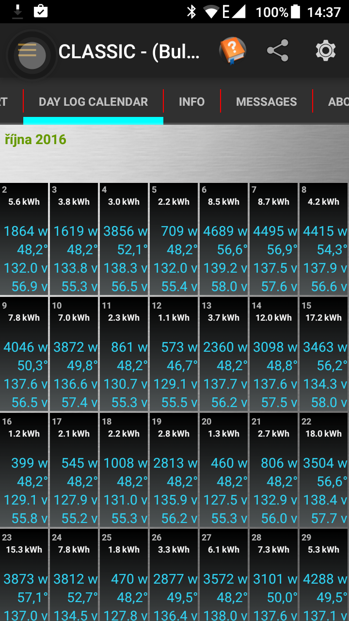 To je pravda, letošní říjen byl na sluneční záření poměrně skoupý, 40 hodin slunečního svitu je spíš listopadový průměr. Odběrový diagram tepelného čerpadla jsem zatím neanalyzoval, mám jej teprve pár dnů a měřicí vybavení pro aktuální hodnoty výkonu je zatím na cestě. Ale podle namátkového měření proudů se zdá, že nabíhá poměrně spojitě a bez rázů. Skoro až příliš pomalu na můj vkus. Z nuly na sto procent to trvá asi dvacet minut. Tabulkově má při +7°C/+35°C příkon 1,9 kW při jmenovitém výkonu 8 kW. Pro -15°C/35°C by měl mít tabulkově příkon 3,44 kW při výkonu 6,3 kW. Při dnešním relativně teplém počasí (10°C) běží pouze na 23% maximálního výkonu.marko250 píše:Jaké špičky má náběh Tvého kompresoru a jaký jmenovitý příkon kybosi?