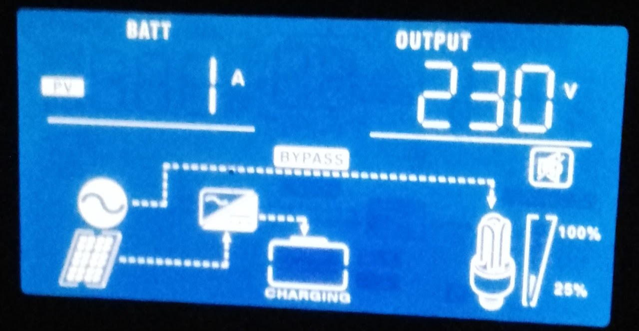 Pokud je menic v tomhle stavu kdy se tvari jako ze nabiji a vypnu ho vypinacem a znovu zapnu, pak hned ukazuje ze je solar odpojenej. Tak jako se tomu stane kolem te pulnoci.