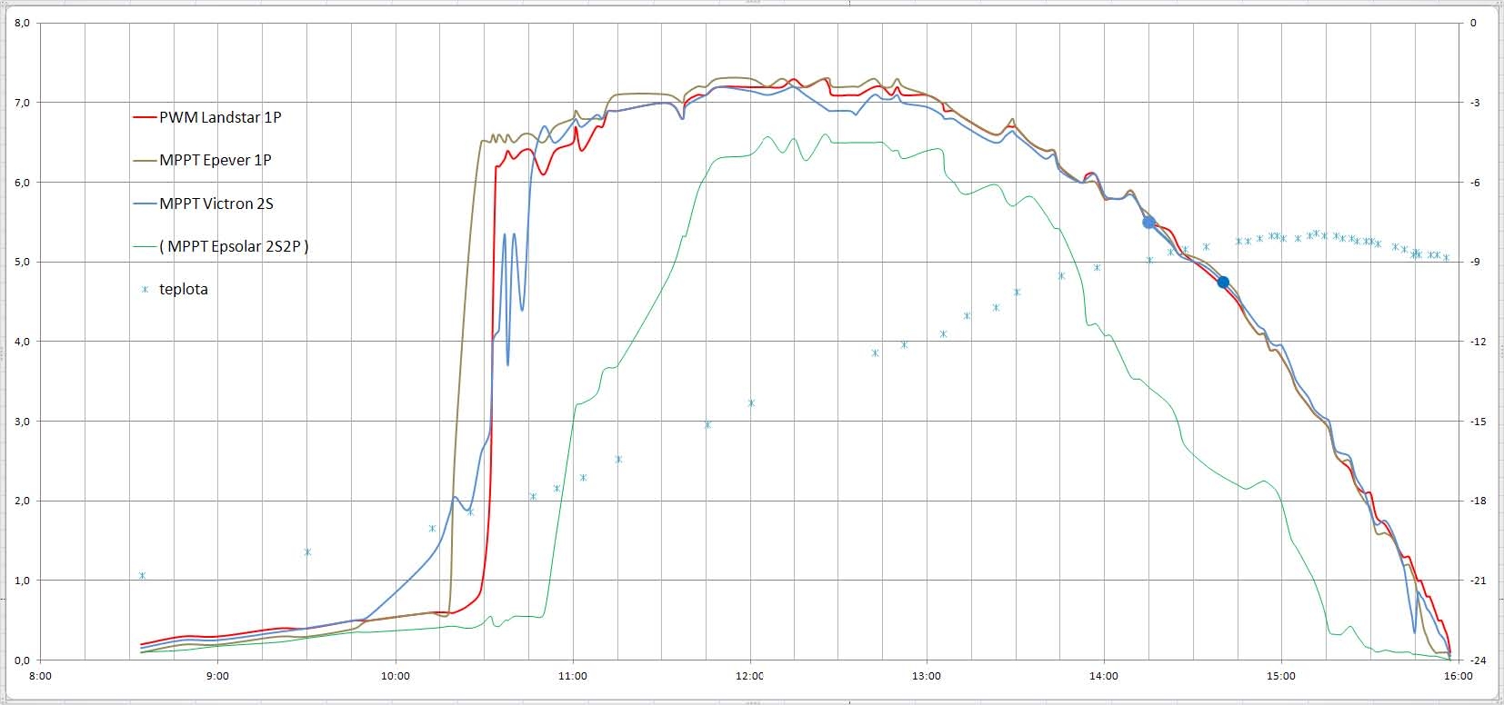 Pri doterajších nízkych teplotách ( -20 °C až +10 °C ) je stále PWM regulátor rovnocenný s regulátorom mppt. Platí to pri porovnaní s Victronom vo variante 1P aj 2S.