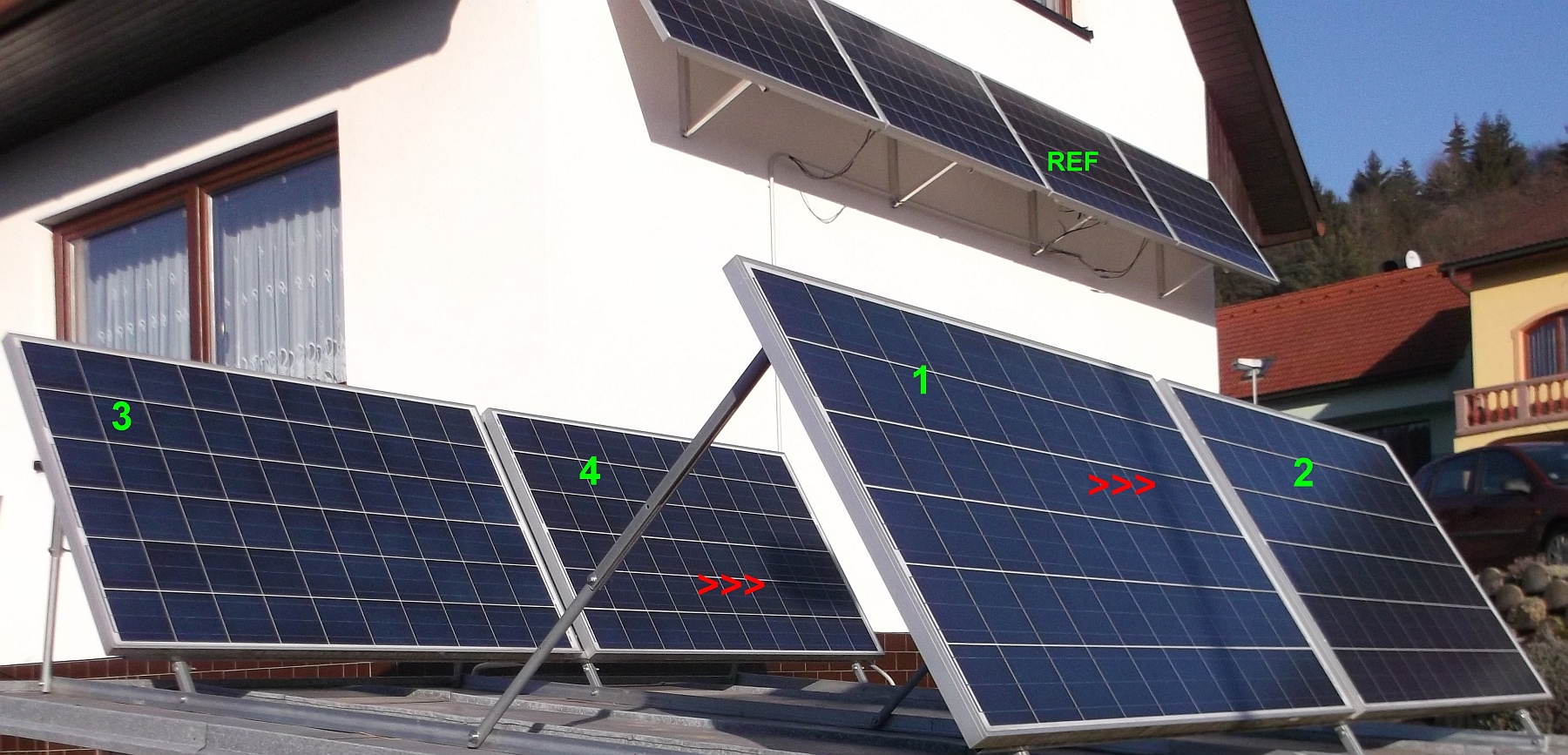 Pre porovnateľnosť výsledkov za dva dni bol ako referenčný panel zvolený nezatienený panel pripojený na PWM regulátor, vyznačený na foto.