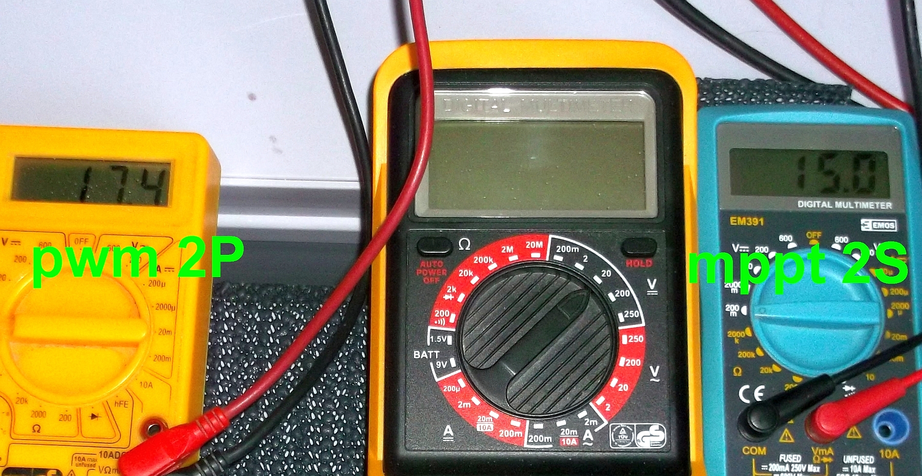 Môžem Vás uistiť, že na prahových hodnotách je na tom pwm lepšie, ako mppt. Asi tak v reláciach 0,3 / 0,2 A alebo 0,5/0,4 A. Merané multimetrom na bočníku, aj po zámene multimetrov. Ten menič treba niečím živiť , nebodaj ešte displej .... Je to o ničom, žiadne víťazstvo ani prehra.