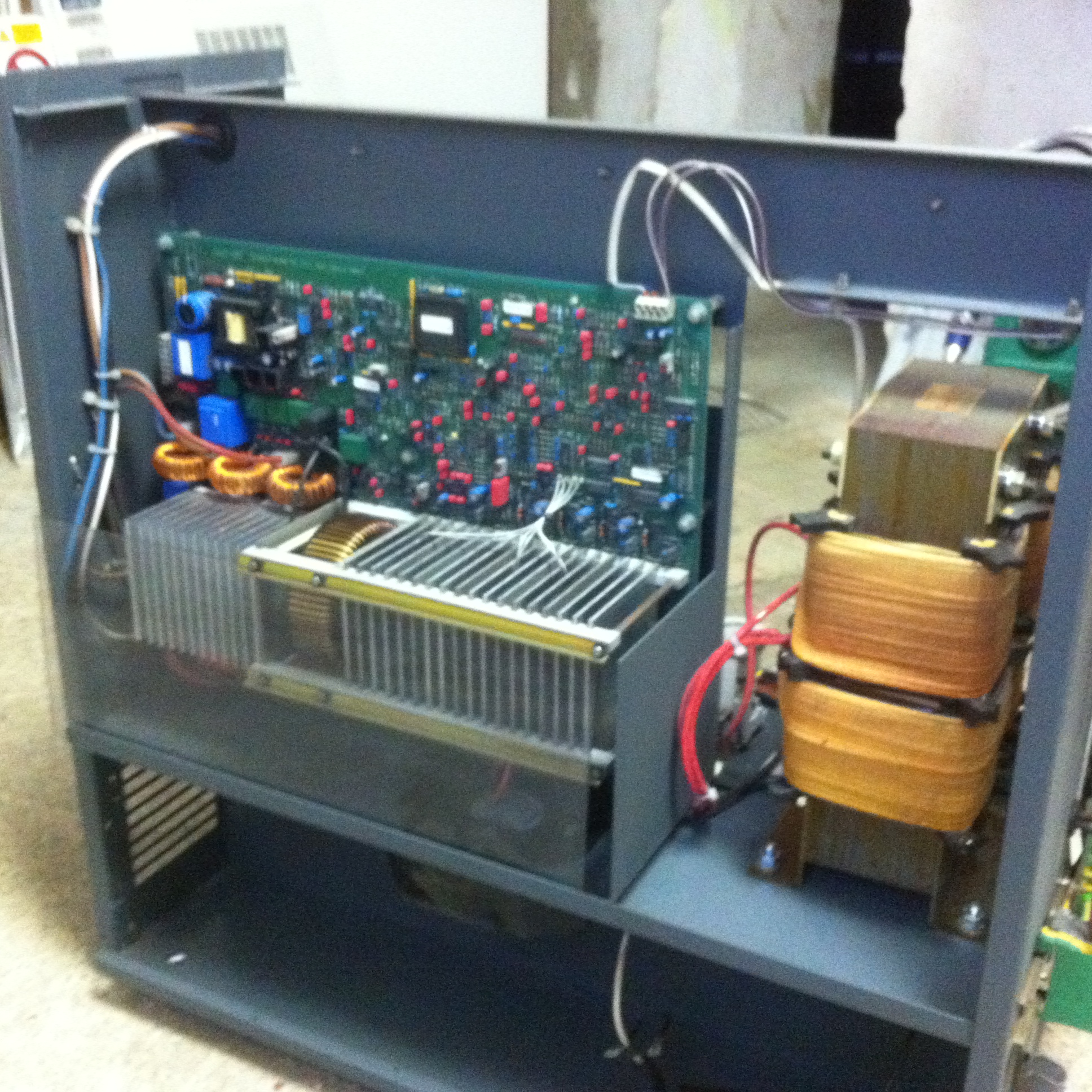 Masivní trafo na C jádru (to je "hranatý toroid"), dimenzované na skutečných 5kW trvalých bez větráku.