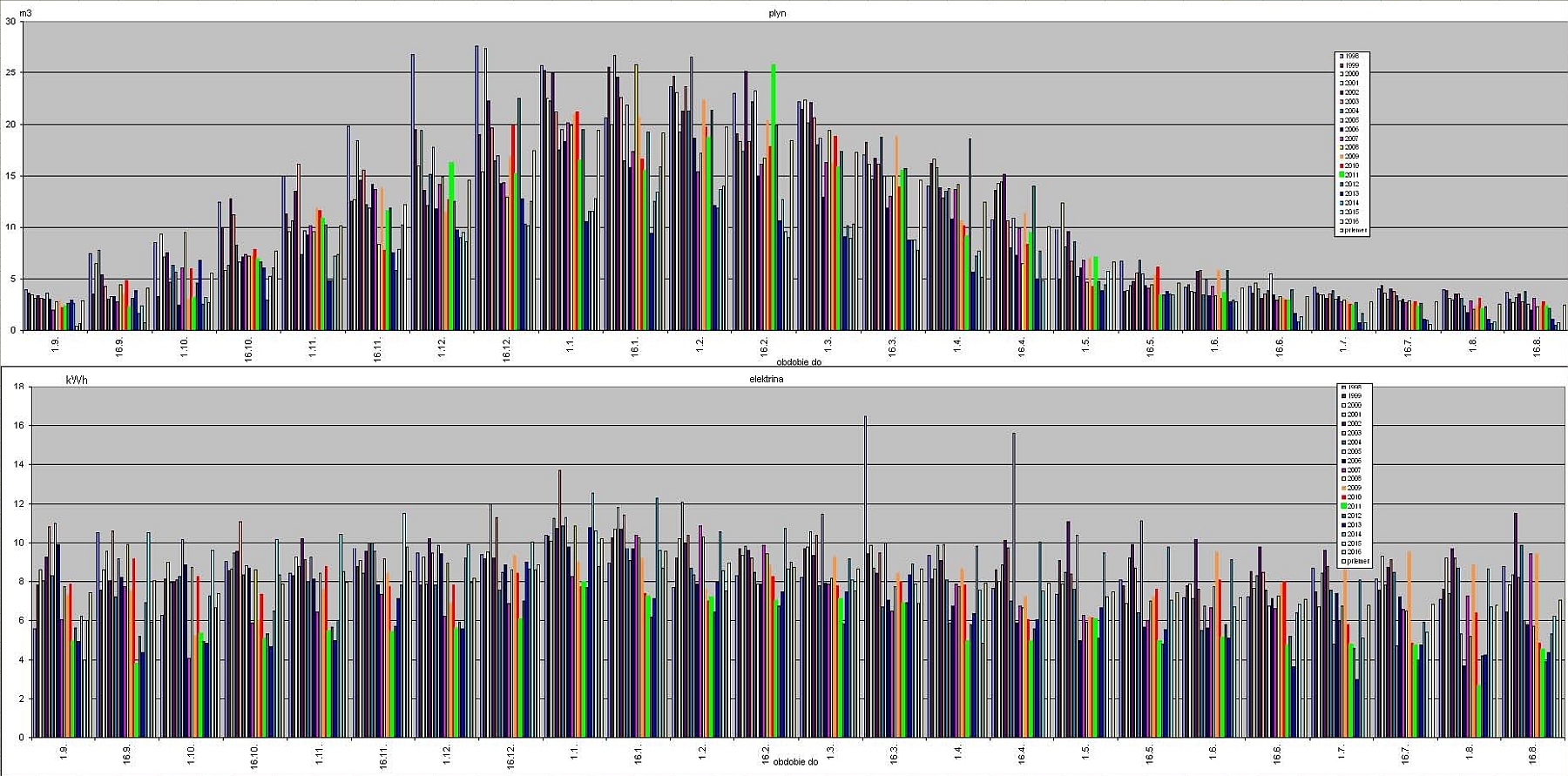 Pripájam dlhoročné štatistiky spotreby plynu a elektriny. Je tam vplyv zlepšenej regulácie, výmeny kotla, zateplenia stropu, výmeny okien, výmeny spotrebičov a polárnej žiary