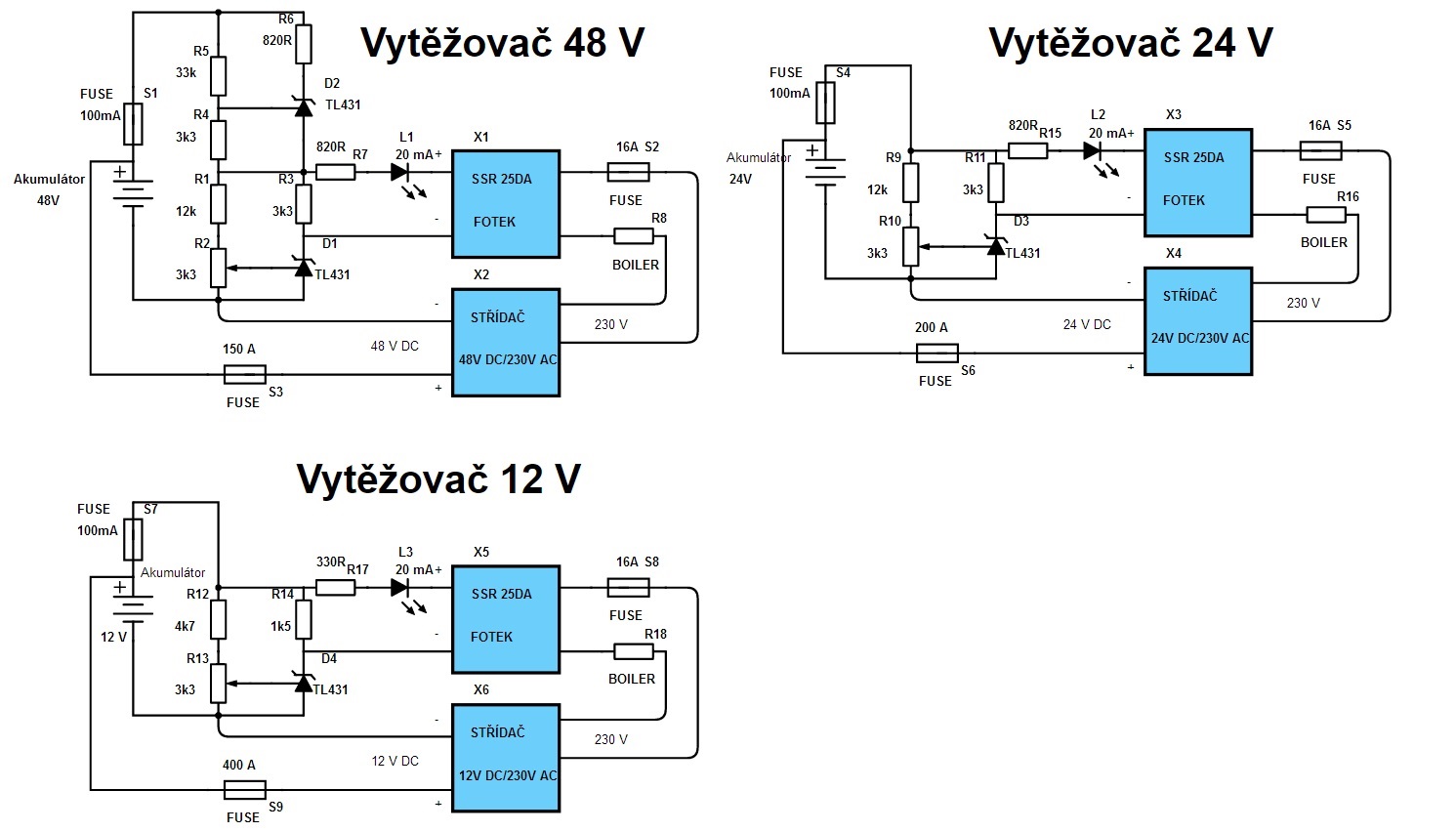 Na to by mohl stačit nějaký napěťový komparátor, ale jen v případě, že je na výstupu střídače zapojen pouze boiler. Pokud střídač napájí i jiné spotřebiče, což je asi vhodnější, muselo by se případné vypnutí střídače řídit sofistikovaněji. Některé střídače mají tuto funkci zabudovanou, jiné ji mohou mít jen na přání a u těch nejlevnějších je to nutno zařídit "zvenku".FRSO píše:to kybos: ještě by nebylo špatné to doplnit o obvod spínání měniče do ON, což by nebyl problém, aby při špatném počasí zbytečně měnič pak neužíral Ah z aku.