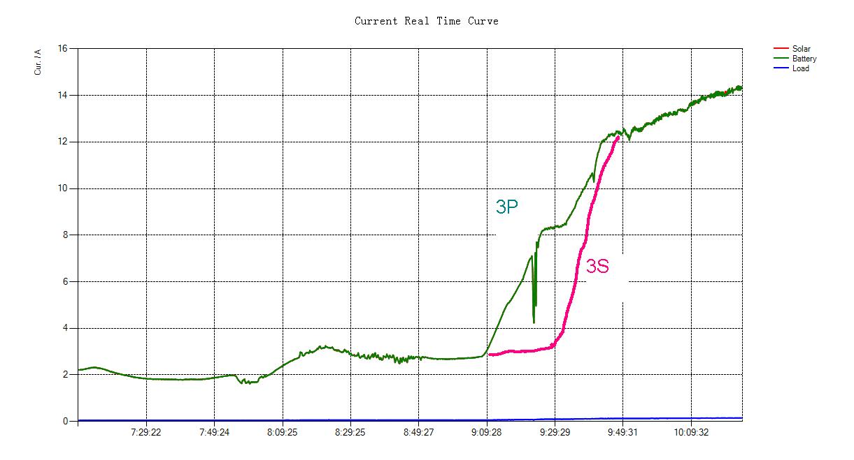 Prečo treba niekedy voliť krátke stringy, vidieť na obrázku z dnešného dňa. Do grafu, ktorý ukazuje, ako rástol prúd postupným osvetľovaním troch panelov 3P, som stareckou rukou dokreslil červenou čiarou, ako by rástol prúd vo variante 3S. Netreba myslím viac komentovať.
