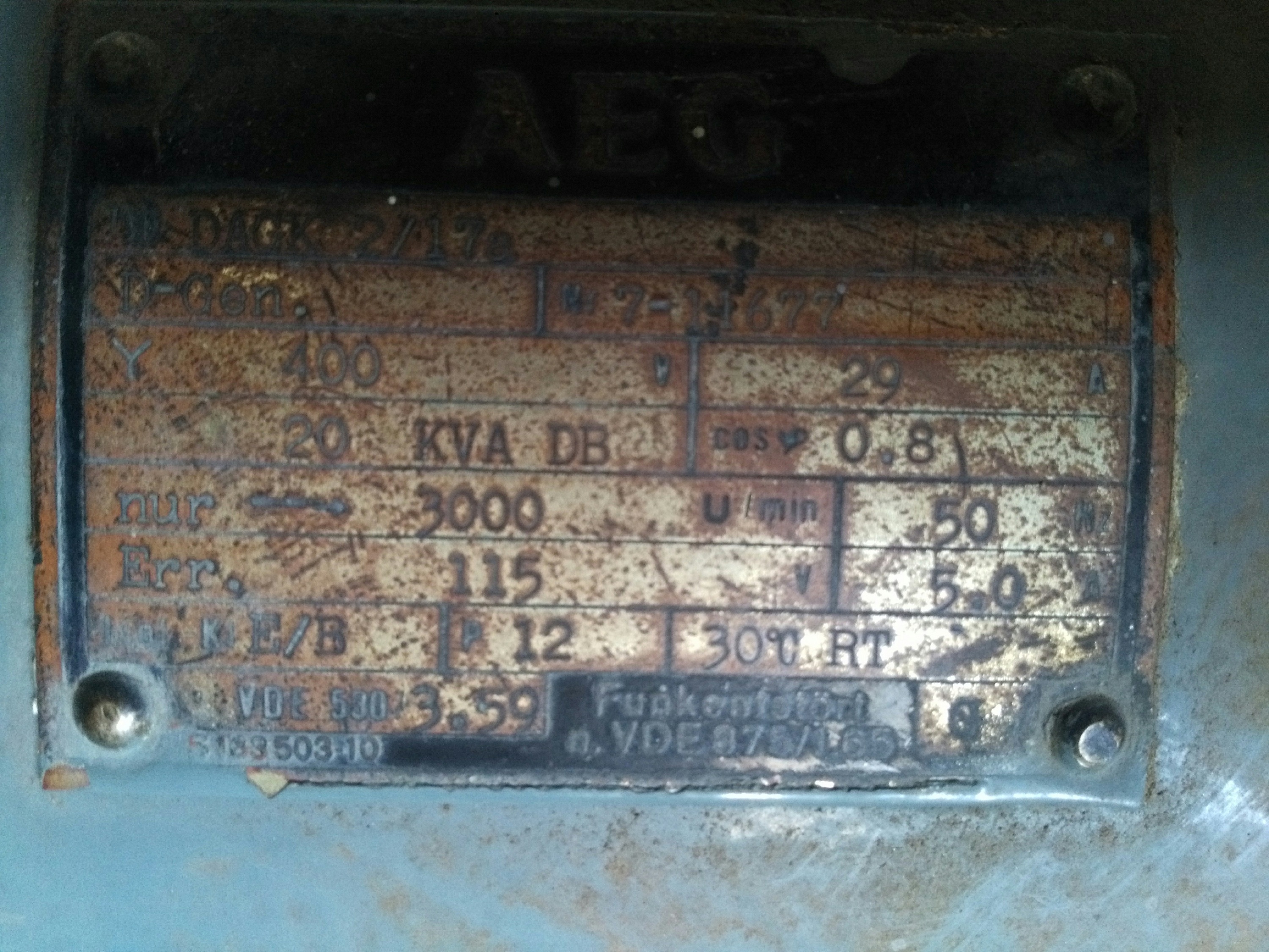 Nabízím generátor značky AEG, který byl původně poháněn motorem VW Brouk a sloužil k nouzovému osvětlení letištní plochy. Později se stal součástí plánované vodní elektrárny, která však nebyla realizována. Generátor je nyní k dispozici k prodeji za dohodnutelnou cenu, včetně technických parametrů uvedených na přiložených fotografiích.