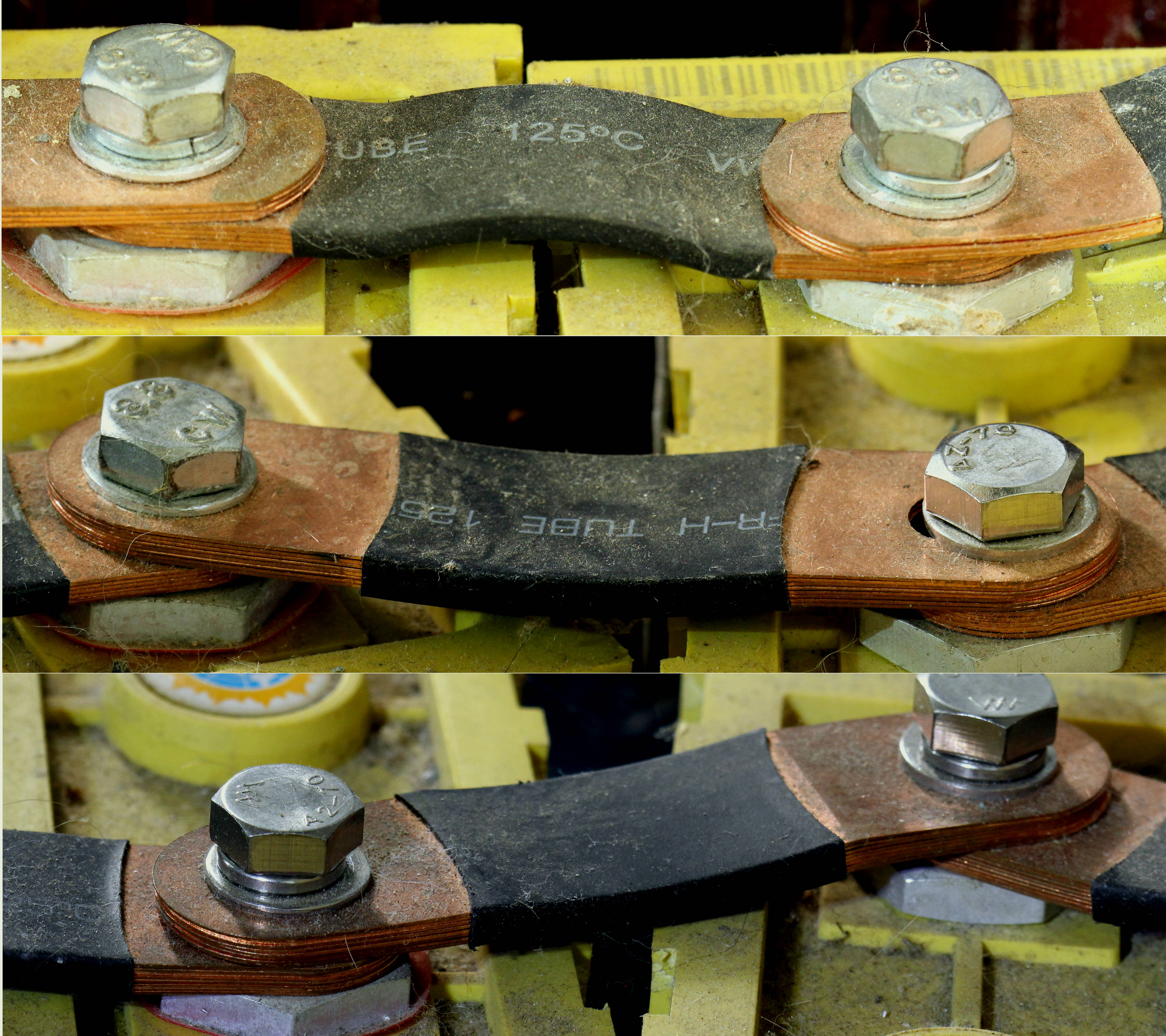 Dle mých zkušeností by se měly spojky v místě terminálů zboku svařit ( ze 3 stran ) a pro dilataci nechat pružnou pouze část mezi terminály. Takto vedou "pouze" horní a spodní plíšek. Ostatní se mezi nimi "flákají".