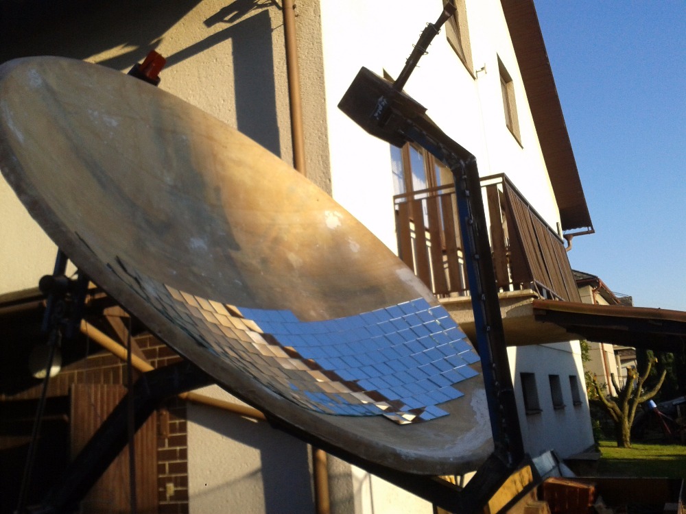 sestavuji experimentální ohřev vody pomocí soustředění paprsků přes parabolický talíř polepený zrcadlovou páskou.