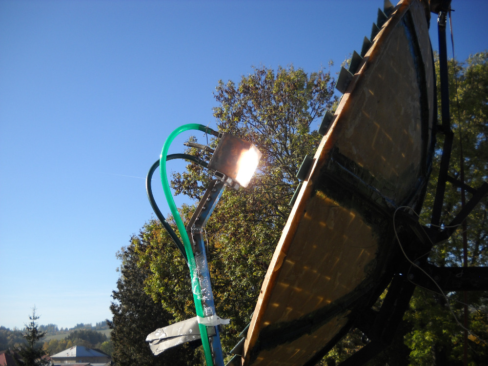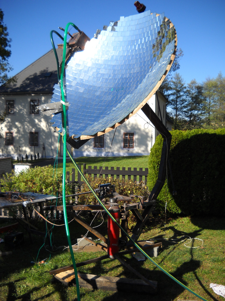 Jak jsem výše napsal fotografie jsoun z rozjezdu systému takže hadice a jiné konstrukční prvky jsou neopracované a provizorní...Konstrukce není v mém vlastnictví,ale byl jsem součástí po straně elektroniky hlavně sledování slunce to byl můj hlavní úkol a ten se podařil bez problémů díky zkušenosti z mé natáčecí SE. přesnost je perfektní (také čekám ještě fotografie finálního vzhledu) ... tento systém a hlava projektu bydlí poblíš Lanškrouna.... sledovač a jeho výroba je v podstatě popsán zde na mých stránkách.