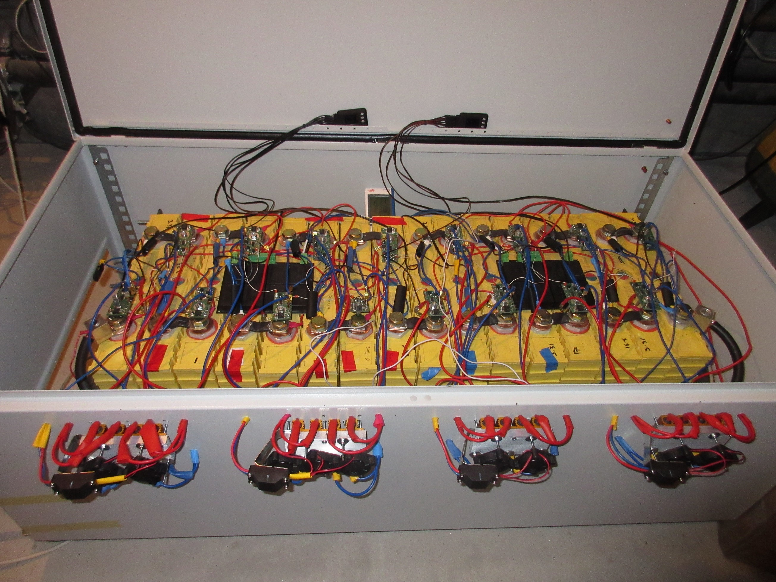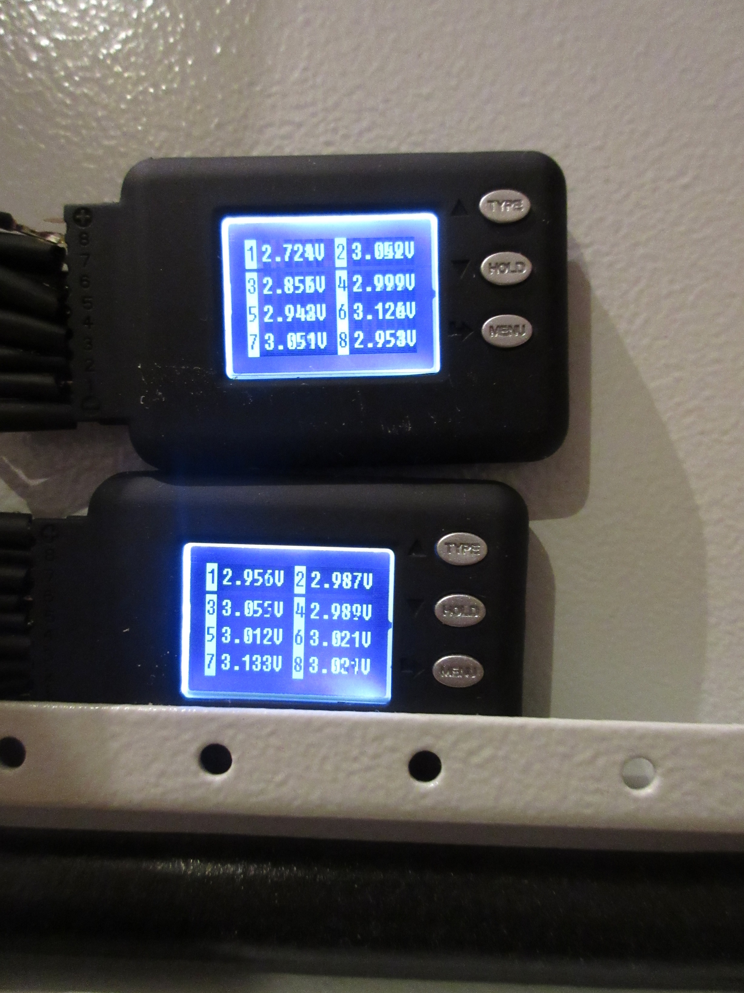 používám paralelně/sériové zapojení 4x8 článků - původně 12V baterie otevřené a pasivně balancované - viz obrázky ZDE. V rámci zimního provozu jednou za čas celý blok baterií napojím na nabíječku a dobiju "do plných", v mém případě to znamená cca. 1 hodinu na maximum aby pasivní balancery chytily vršek 3,6V a ostatní články měly čas se dobít taky. Po instalaci monitoringu jsem včera při této akci dostal SMS, že se objevila závada na bateriích. Fyzickou kontrolou jsem zjistil, že články nejblíže + pólu celého bloku (první dva z levé strany na obr) mají napětí 4,1V, cca. 20 minut než jsem to vypnul. Pasivní balancery topily, fungovaly, ale asi na ně toho napěťového rozdílu bylo moc... Ostatní články byly na napětí kolem 3,2 - 3,3V. Po vypnutí se všechny články srovnaly na rozdíl 12-20 mV.