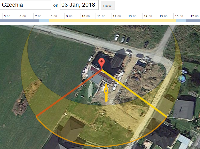 Pokud můžete, optimalizujte umístění panelů na jih se sklonem 60°až 70°Jak obrázek níže napoví, směrem na západ už toho od září moc vyrobit nejde. Složité a nákladné konstrukce neuvažuji, jelikož chcete ušetřit... Příklad: U mě (prosinec-leden) s orientací JJZ (210°) bude více efektu z panelů umístěných svisle na stěně (šipka) než vyrobí panely na střeše se sklonem 43°. Stačí ověřit Vaši polohu na http://www.suncalc.net/Janma píše:Dům má plechovou střechu sklonem cca 20 stupňů na západ(4x17m).Je zde štít s betonovou taškou o rozměru 2x9 m také na západ.Mohla by zde být konstrukce směr Jih.
