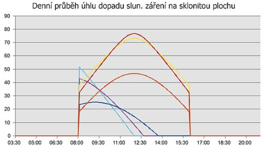 Zde je modelový příklad: (pro vás platí ta modrá křivka, apr. východ může být někde výhodnější než západ a naopak) Denní průběhy úhlu dopadu slunečního záření na sklonitou plochu orientovanou na jih a východ(západ) v době zimního slunovratu. Azurová křivka: sklon 90°, orientace na východ, fialová křivka: sklon 60°, orientace na východ, modrá křivka: sklon 30°, orientace na východ, žlutá křivka: sklon 90°, orientace na jih, červená křivka: sklon 60°, orientace na jih, oranžová křivka: sklon 30°, orientace na jih.