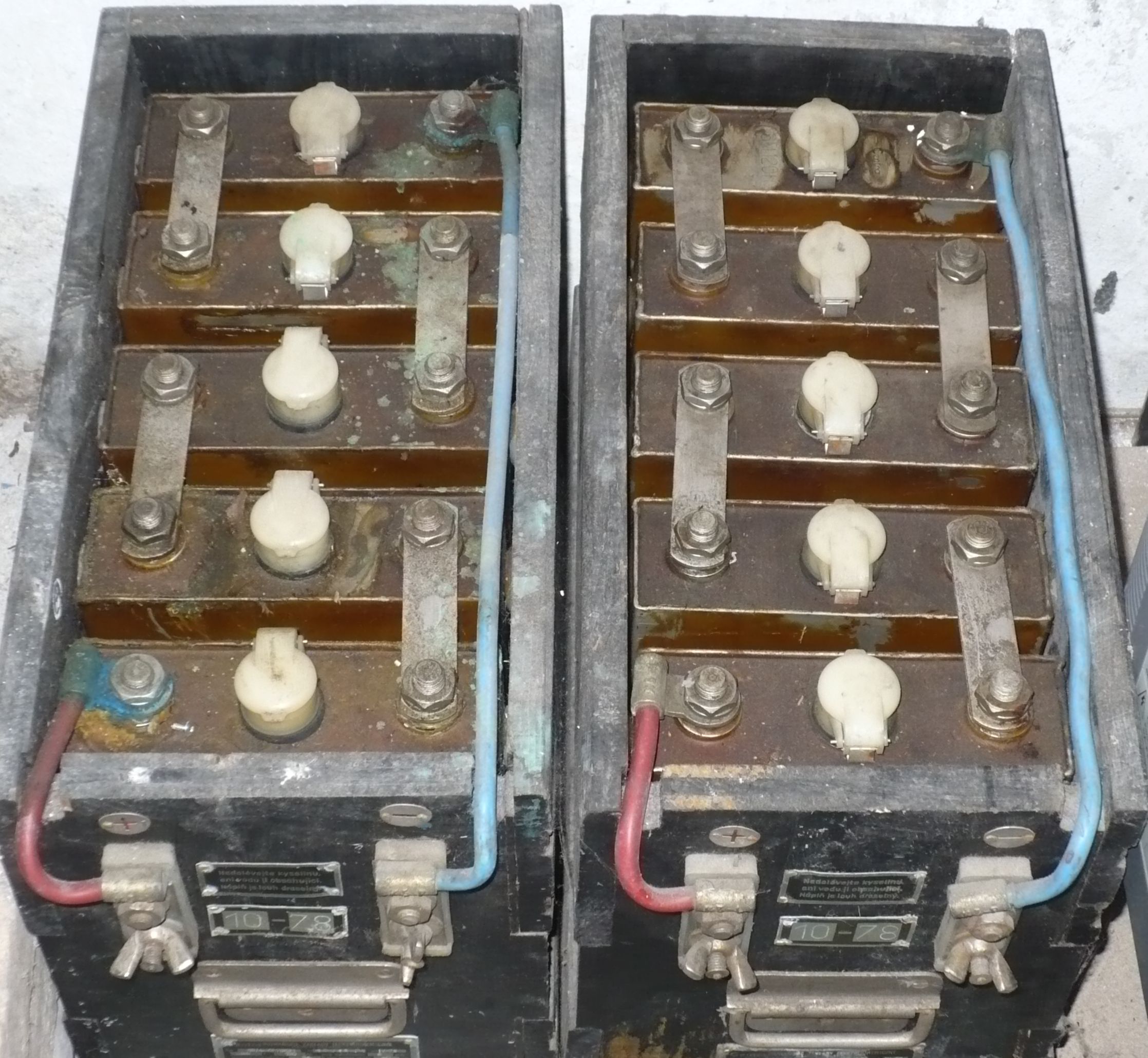 Nabízím 2 bedny louhovek 120Ah, vše je patrné z fotek...Stav neznámý, jsou nalité, původní vosk na článcích...jedna sada má 6V, druhá 6,7V.