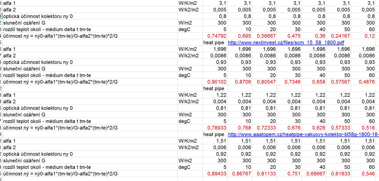 Když jsem zvažoval, jaké termické kolektory pořídit, tak jsem si pro běžně dostupné kolektory z jejich uváděných parametrů spočítal účinost za různých rozdílů teplot média a okolí. Z toho mi vyšlo, že ploché jsou nevhodné za nižších teplot, protože skoro všechno zachycené teplo uteče. Pokud je rozdíl teplot 40 st.C, tak deskový má účinnost 36%, zatímco heatpipe přes 60%. Jen ještě doplnění - princip heatpipe využívá k přenosu tepla fázové přeměny a tento způsob je o několik řádů rychlejší, než přenos tepla vedením a i výkonnější, než přenos tepla prouděním. Proto se používá i na jiných místech.