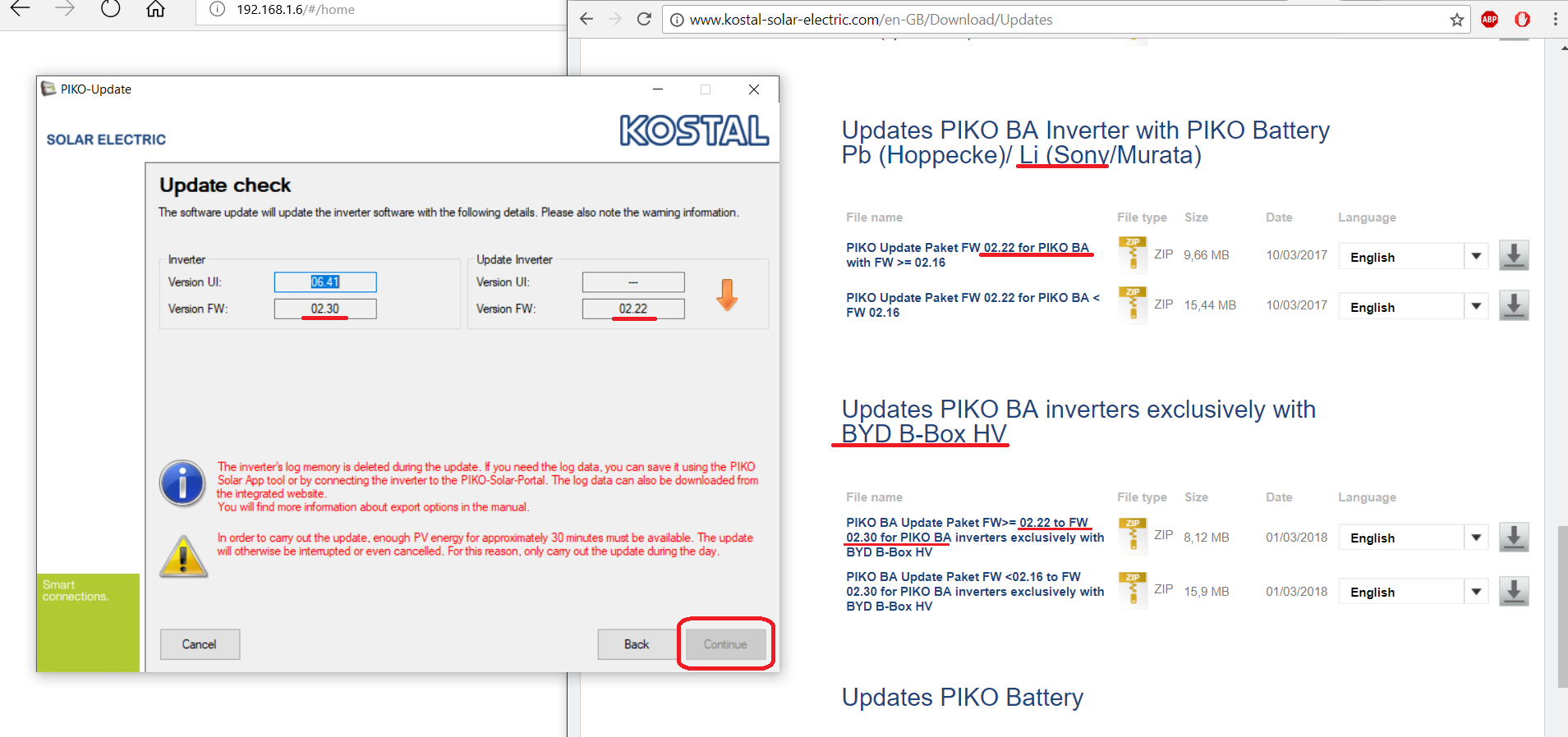 Stala sa mi taká vec že som inštaloval aktualizáciu na menič Kostal PIKO 6.0 BA. K meniču som si kúpil a pripojil originálne batérie KOSTAL (Sony) 7,5 kWh. Bohužiaľ pri sťahovaní aktualizácie som si nevšimol že som stiahol aktualizáciu pre nový typ batérie BYD B-Box HV ktorá už taktiež spolupracuje s týmto meničom. Bohužiaľ kostal to nemá nijako opatrené a preto som túto aktualizáciu aj bez akéhokoľvek problému nainštaloval, následne mi moje batérie Sony zablokovalo a prestalo ich nabíjať či vybíjať, jednoducho len stoja a pomaly strácajú svoju kapacitu. Nainštalovať späť tú správnu aktualizáciu bohužiaľ nie je možné keďže je označená ako nižšia resp. staršia aktualizácia a staršiu aktualizáciu na novšiu nie je možné nainštalovať. Aktualizácie pre BYD B-Box HV je označená ako 02.30 a pre sony 02.22. Prikladám aj obrázok pre lepšie pochopenie.