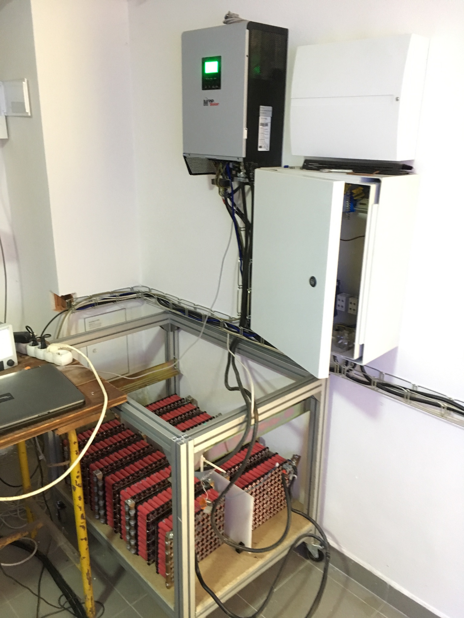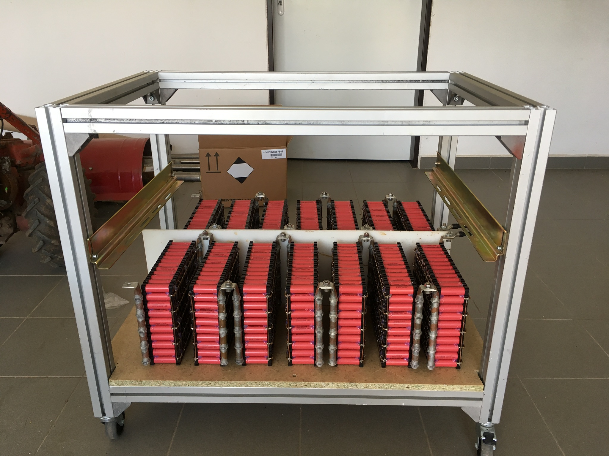 a postavil ještě vozíček. Mám další články na 15kWh, tak doufám, že za chvíli přibude další patro. Připojil jsem provizorně do systému a zkouším jak se to bude chovat. Zatím to vypadá super. Vnitřní odpor vychází cca 5,6mOhm, což je zhruba 0,4mOhm na článek.