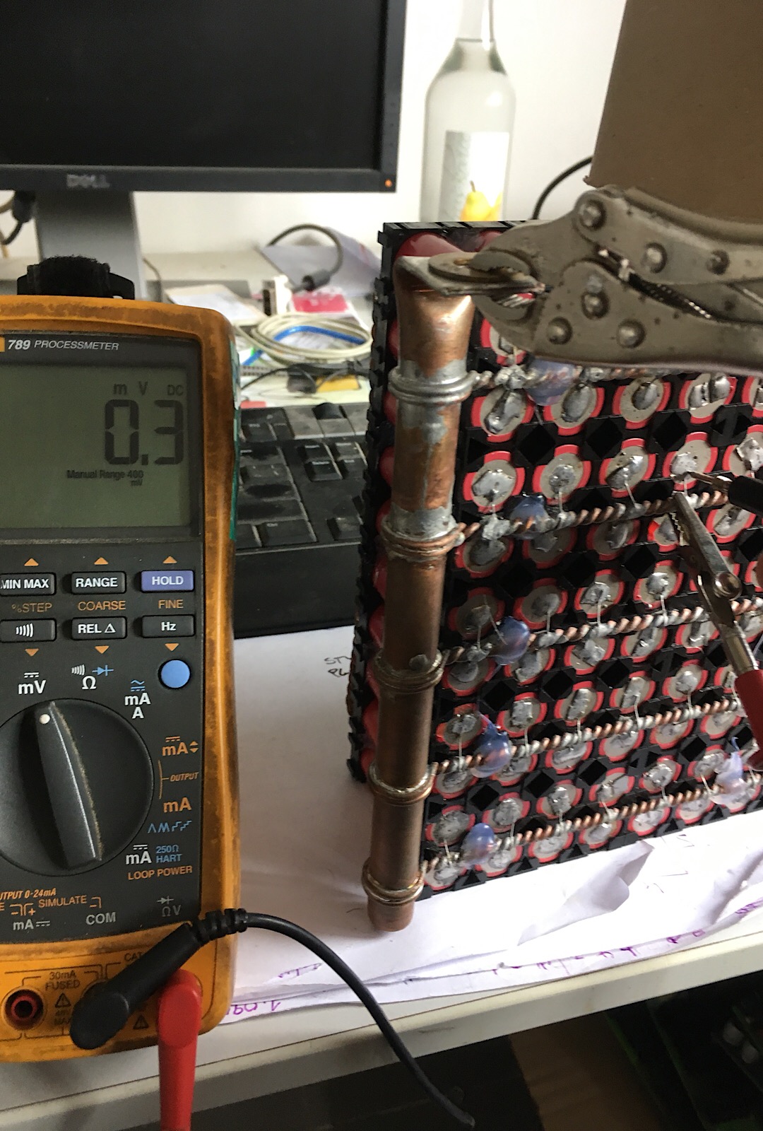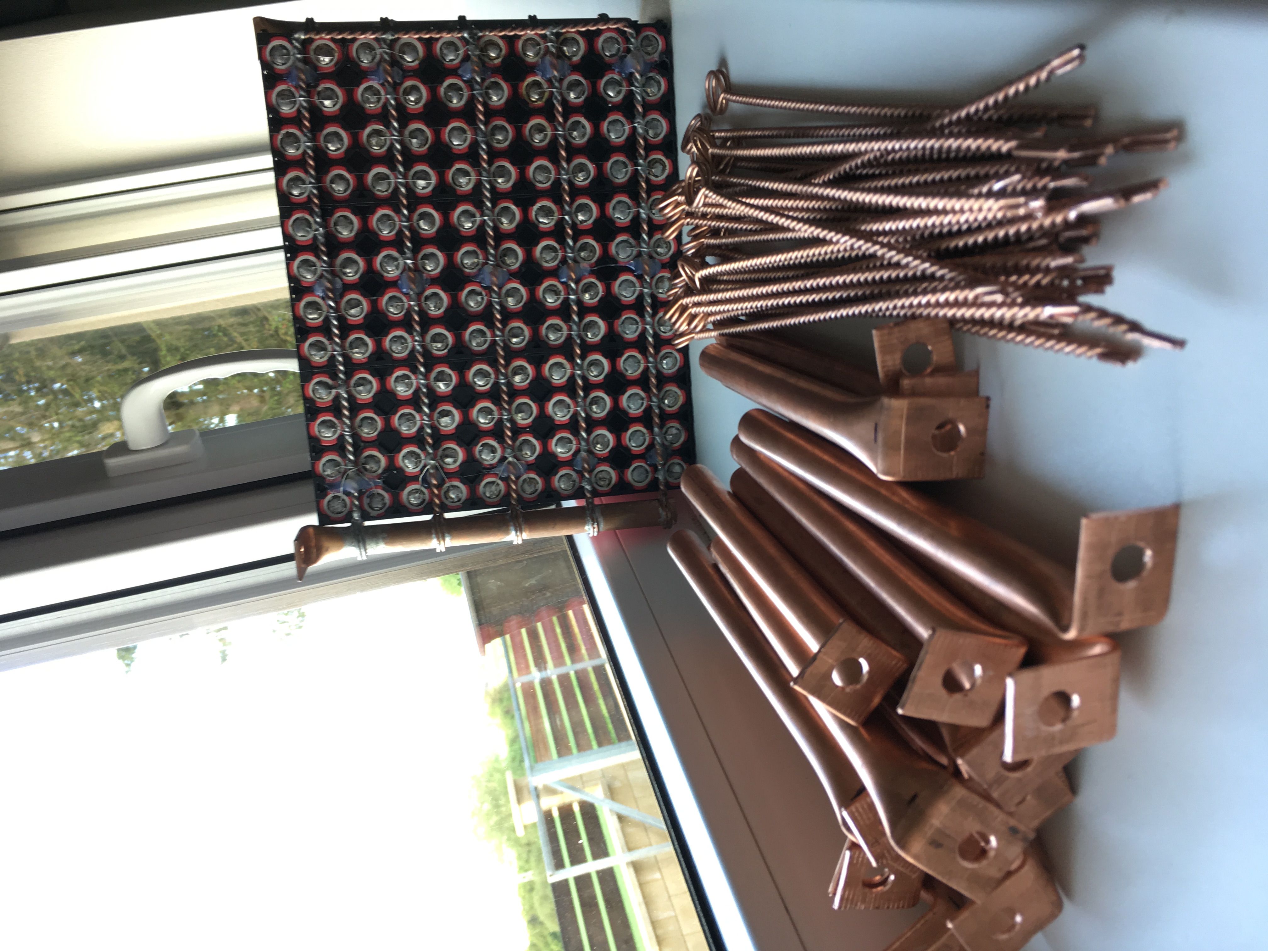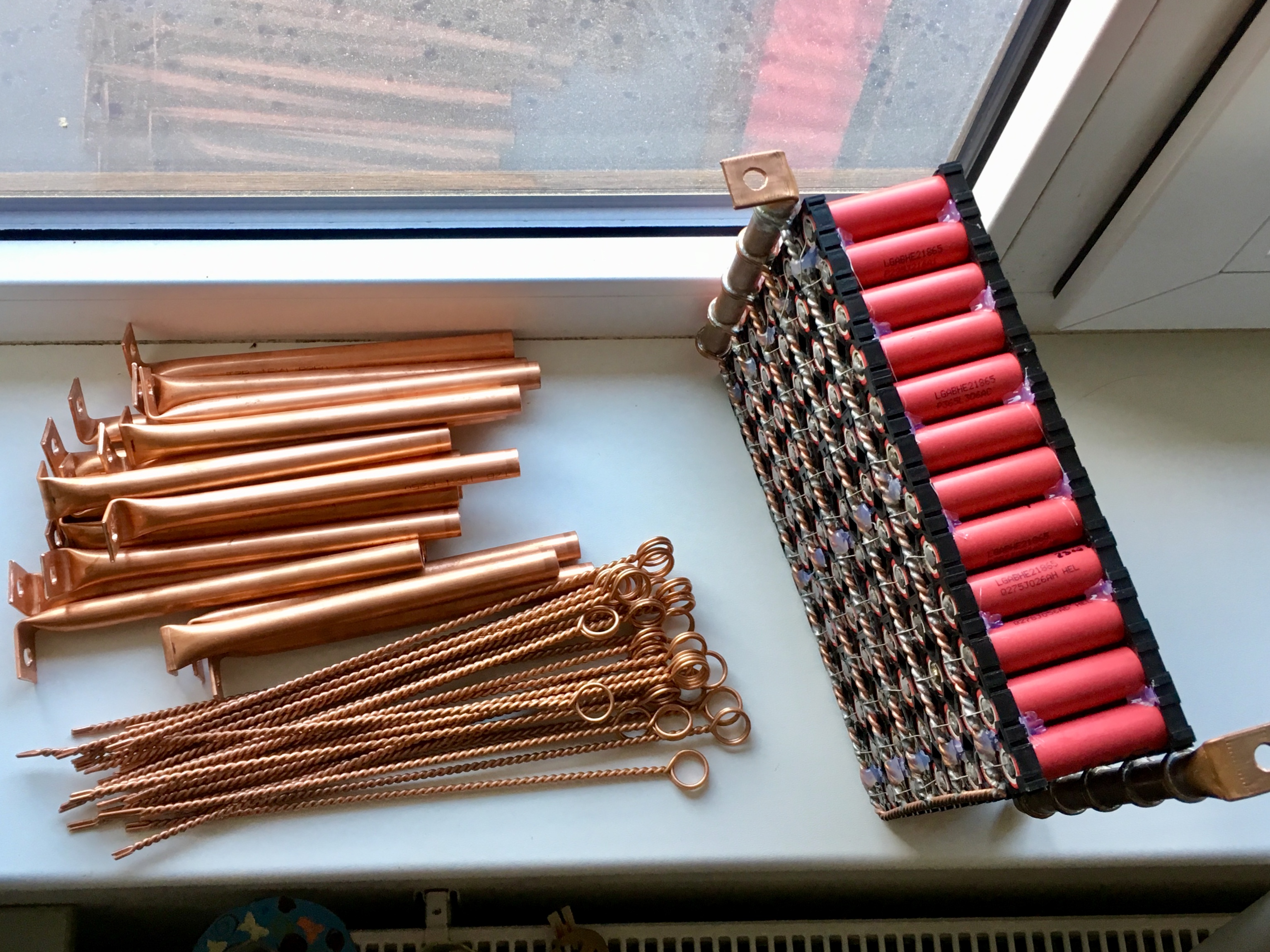 Co se týče článků, podařilo se mě sehnat LG HE2. Jsou to high drain (20A) články 2500mAh. Na sběrnice jsem zkroutil 2x4mm2 dráty ze zbytků. Hlavní sběrnice 120P bloku je z Cu trubky 15x1mm, něco zbylo ze stavby, tak jsem to využil a ještě 1,5m musím dokoupit. Pojistný drátek na jednotlivých článcích je 0,4mm Cu pocínovaný, taky někde ze zbytků.