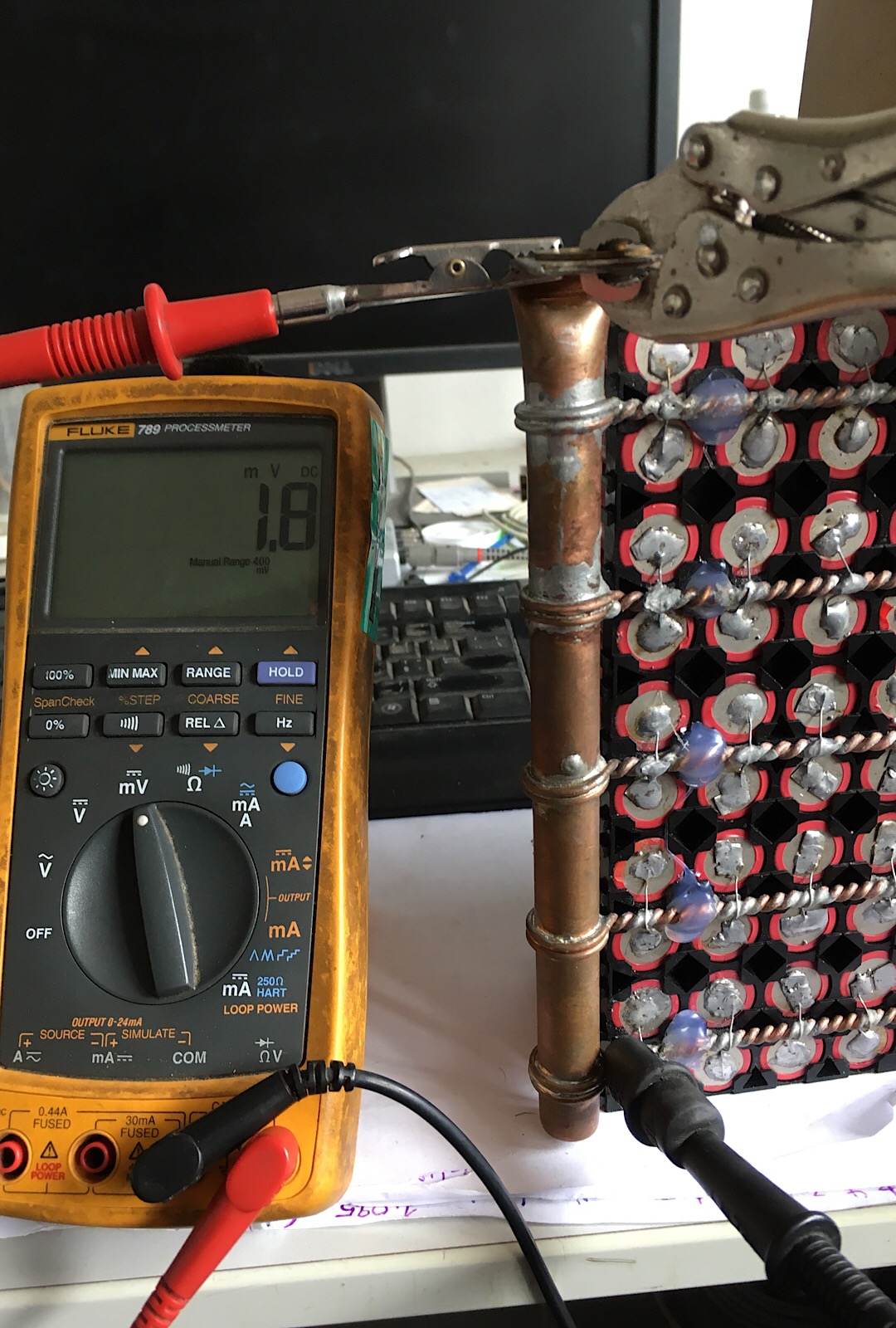 Nejhorší je přetěžovaný a nevratně přetížený kontakt nejen na oku nebo na (pod) kontakt plusu nebo minusu, ale uvnitř kontaktní spoj mezi elektrodou která je podle všeho plech o síle kuchyňského alobalu a vodiče mezi tímto plechem a tím koncem plus minus. Zaplavené NiCd co mám to nějak moc neřeší a proto se elektrodová hmota chová tak jak se chová a má to v podstatě tak jak to pájíš, jenže proudové zatížení je optimální někde u 0,2C. Jenže u tvých válečků jdou proudy přes 1C a právě při tomto pohybu je potřeba měřit. Určitě nato je nějaký vzorec. Nejlepší je ty napětí proměřit na vzdálenostech přímo na těch pájených spojích multimetrem při pohybu nábojů. Tam bych řekl že horní řady budou vykrývat malé spotřeby a spodní s budou flákat při odepnutí se to celé bude vyrovnávat na hmotě coby sdruženého článku. A při dodávání náboje to bude obráceně, horní řady hmot se budou více "změkčovat" a spodní budou jakou si setrvační hmotou. Tyto válečky mají vyšší nom. napětí, ale u NiCd do fyzicky znamená při pravidelné přepóváváni spodní hmoty situaci, kdy spodní elektrodová hmota je přepólována zatímco horní je v polaritě jinak. Spoj jako takový na bočních svodičích se títmo standardním připojení kontaktů problematicky velmi chová od začátku co to Edison(NiFe) nebo Jungner(NiCd) navrhl do výroby.