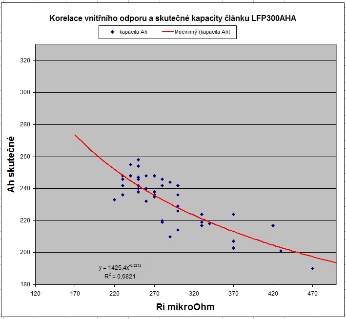 To co mi graf spise ukazuje, je ze pokud je hodnota vnitrniho odporu v rozsahu cca 200-300mikroOhm, neni mozne podle nej odhadnout kapacitu. Podivejte se na rozptyl hodnot. Nepredpokladam ze by novy clanek mel odpor 90mikro.