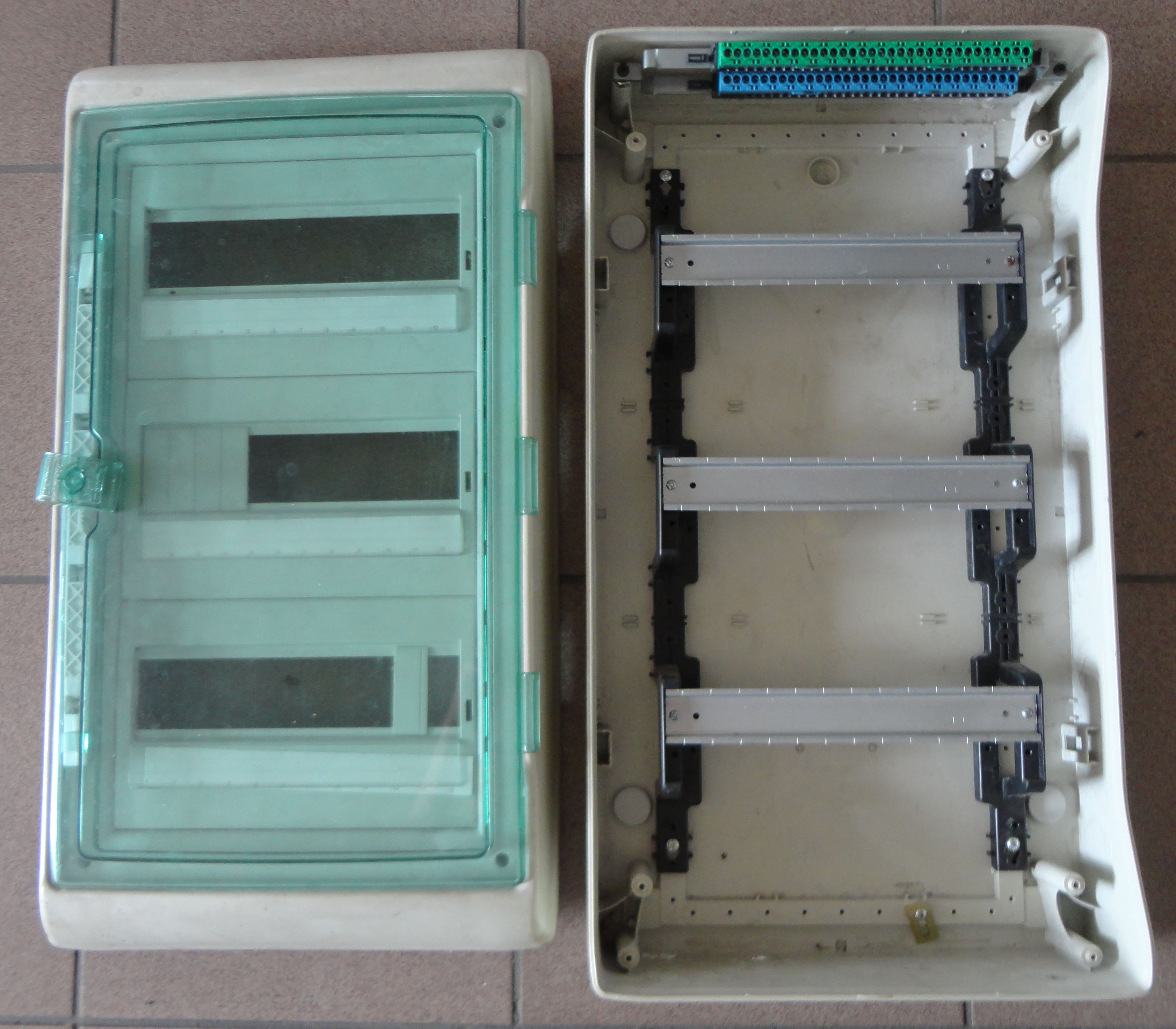1x starší použitý, 3x12, IP65, Schneider. 2x nový, celý ve folii, ETI, 3x18, IP40, lišty, svorkovnice PE+N, sada "ucpávek".