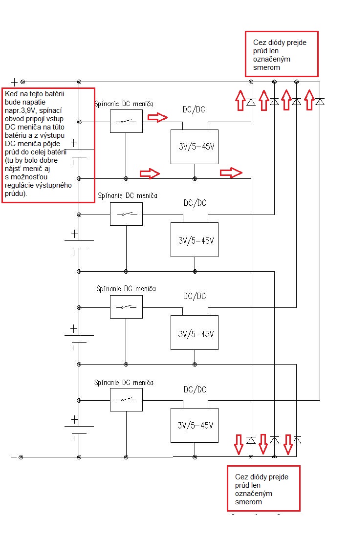 Chcel by som použiť zvyšujúce DC/DC meniče, pomocou vhodného spínacieho obvodu ich pripájať na jednotlivé batérie a z výstupu DC meniča napájať cez blokovacie diódy celú batériu.