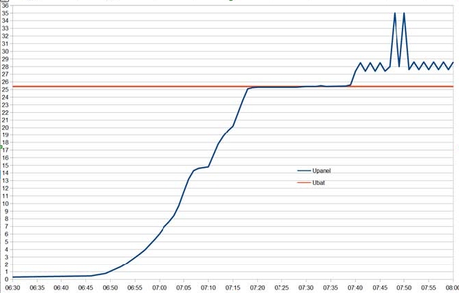 Pri silnej zrážkovej oblačnosti som dnes ráno nameral takéto počiatočné hodnoty napätia na paneli : Prúd panela resp. prúd do batérie bol nemerateľný, hlbko pod 0,1 A. Rozpoznateľný bol o 7:25 začiatok dodávky minimálneho prúdu do batérie po prekonaní vlastnej spotreby regulátora. Začiatok vyhľadávania mpp je zrejmý od 7:39 a regulátor našiel pri aktuálnom napätí batérie 25,4 V mpp rovné 27,4 – 28,5 V. Napätie panela teda osciluje na na napätí Ubat + 2,5 V.