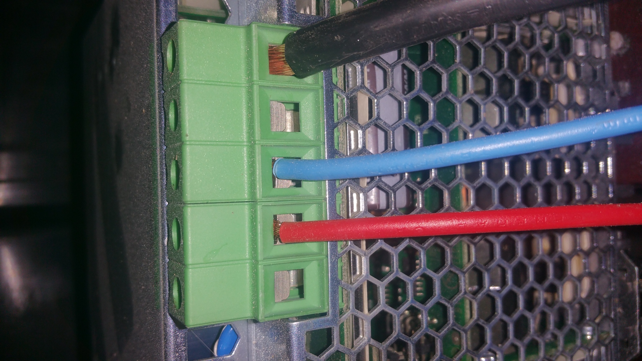 Zdroj má dvě plusvé zdířky a tři minusové. Vodič cca 16.Na fotce je červený a modrý 2,5. Min napětí co jsem změřil bylo cca 15,5-15.6V - připojeno na baterce-měřeno na svorkach zdroje.pak napeti rychle rostlo.