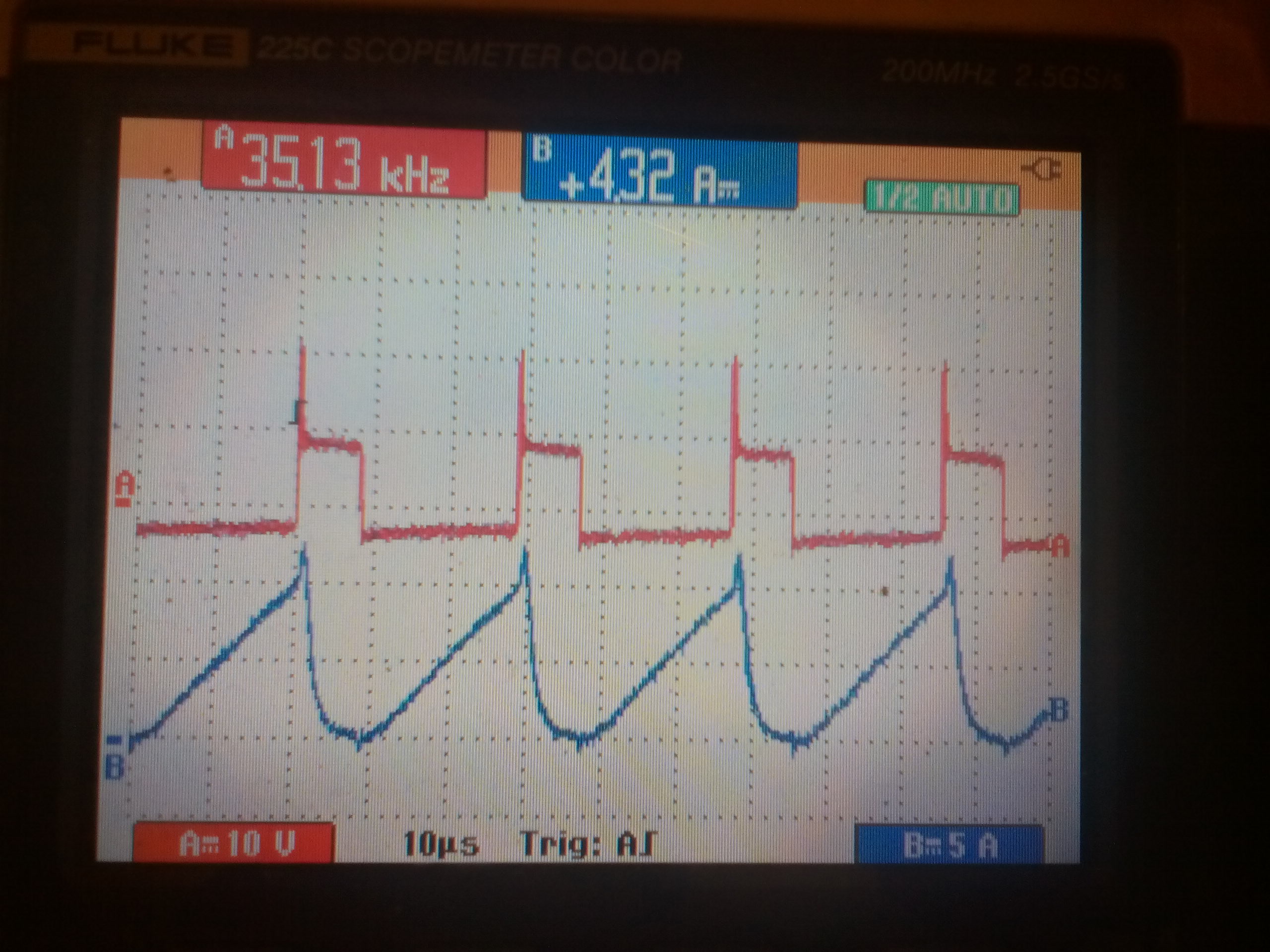 Podle průběhu proudu na primáru se ti to tráfko těsně před vypnutím přesycuje, ale to je asi daný principem samokmit. měniče. Copak se asi stane, když o nějakou setinu zvětšíš vzduchovou mezeru?