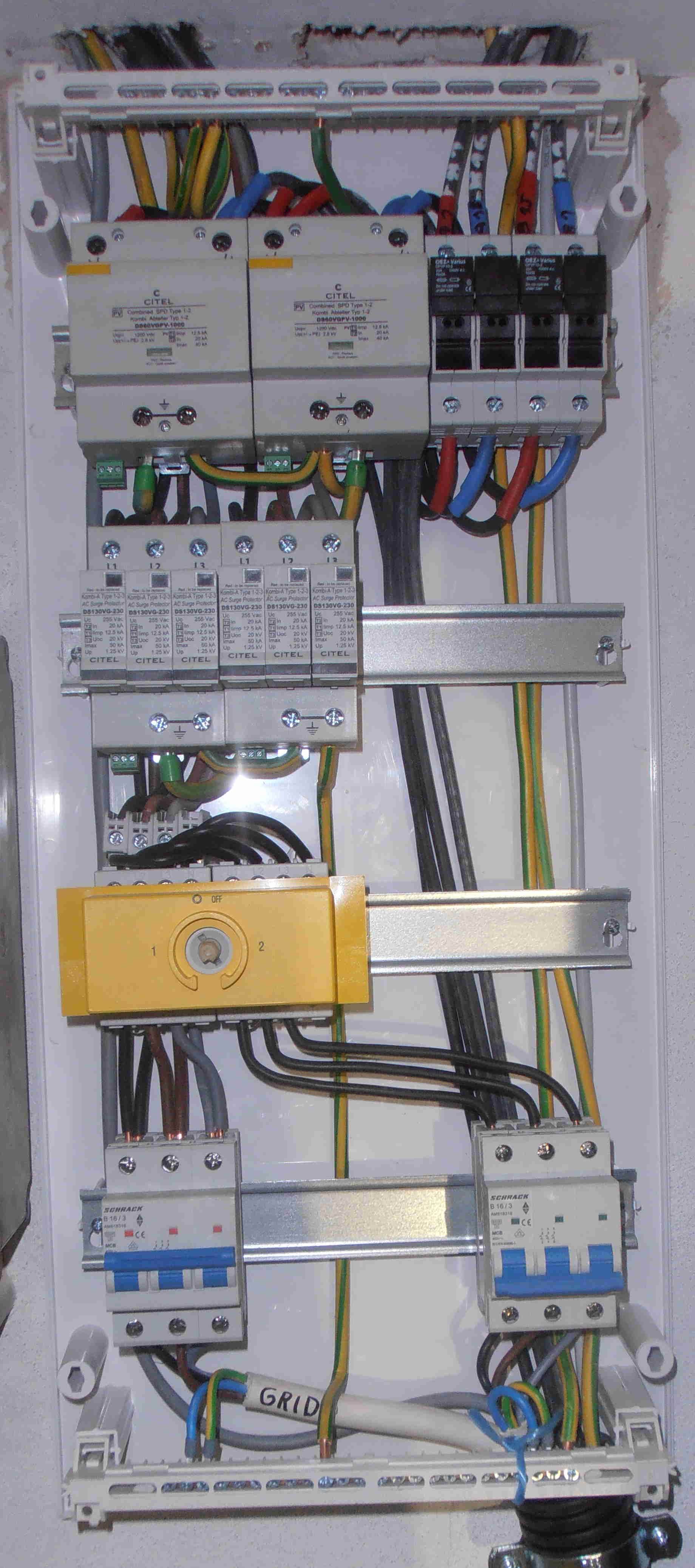 Pozor na to že svorka PE v řadě svorek EPS není s ničím spojená a vede zřejmě pouze na to relé. Standardní svorka PE spojená s šasi střídače, varistory, filtry atd... je hlouběji v přístroji jako šroub s maticí. Zapojil jsem to pro sít TNC (to v návodu chybí) a myslím že je to bezpečnější, nehrozí odpojení nulového vodiče a zničení spotřebičů a také přerušení spoje N s PE a nefunkčnost ochran a lze tak i dosáhnout nižší impedance. Dále na jednotlivé okruhy spotřebičů, světel a zásuvek už je klasická síť TNS.