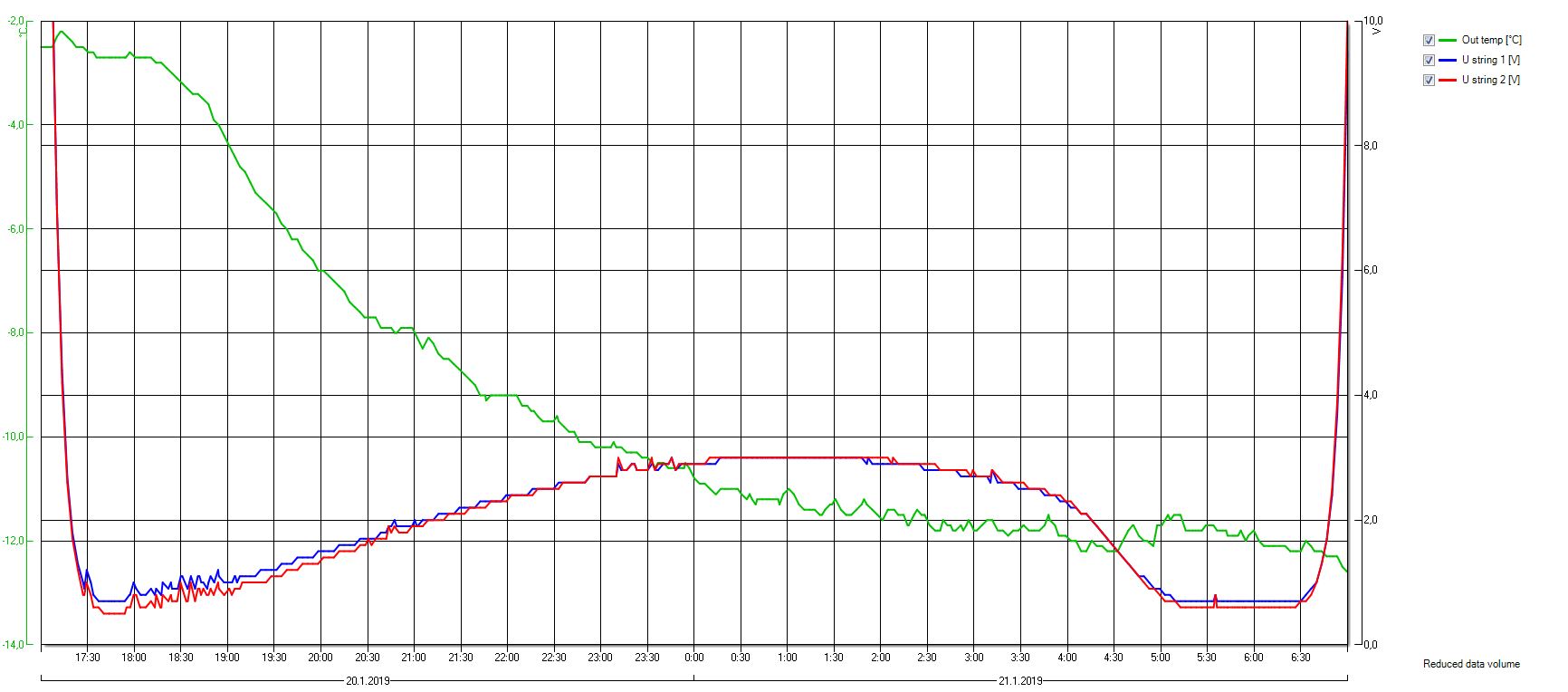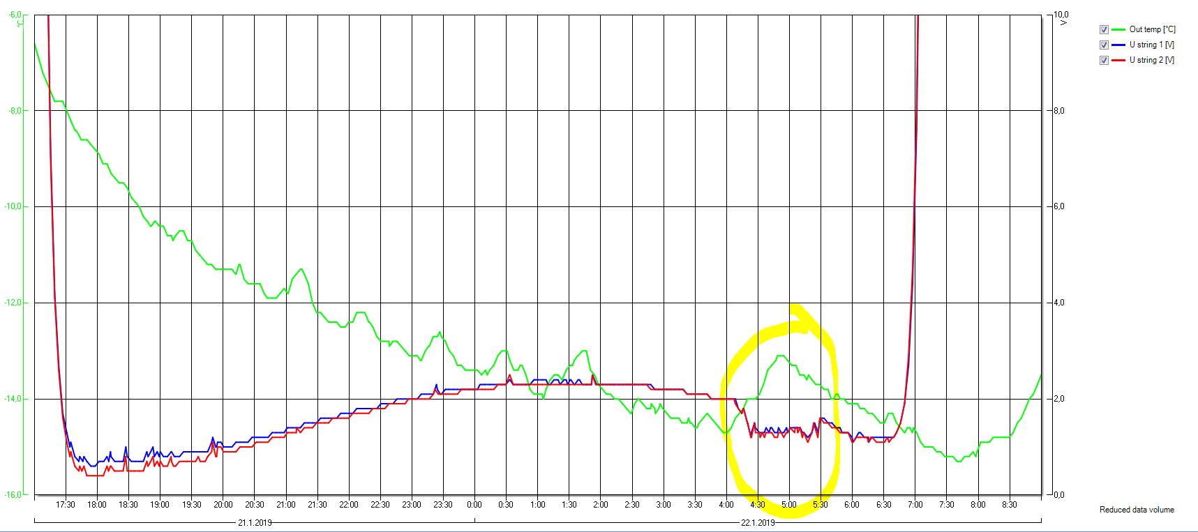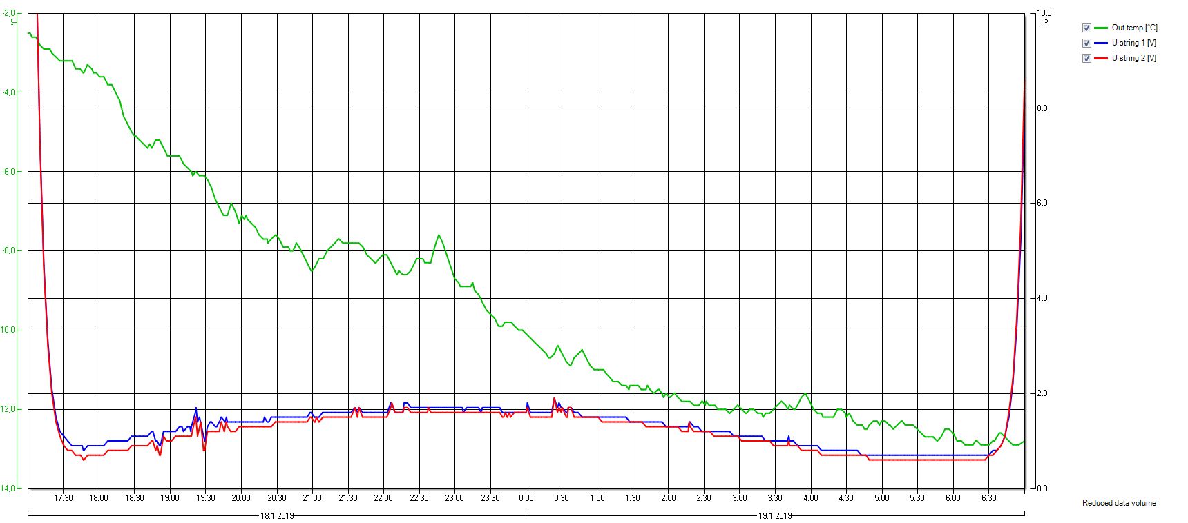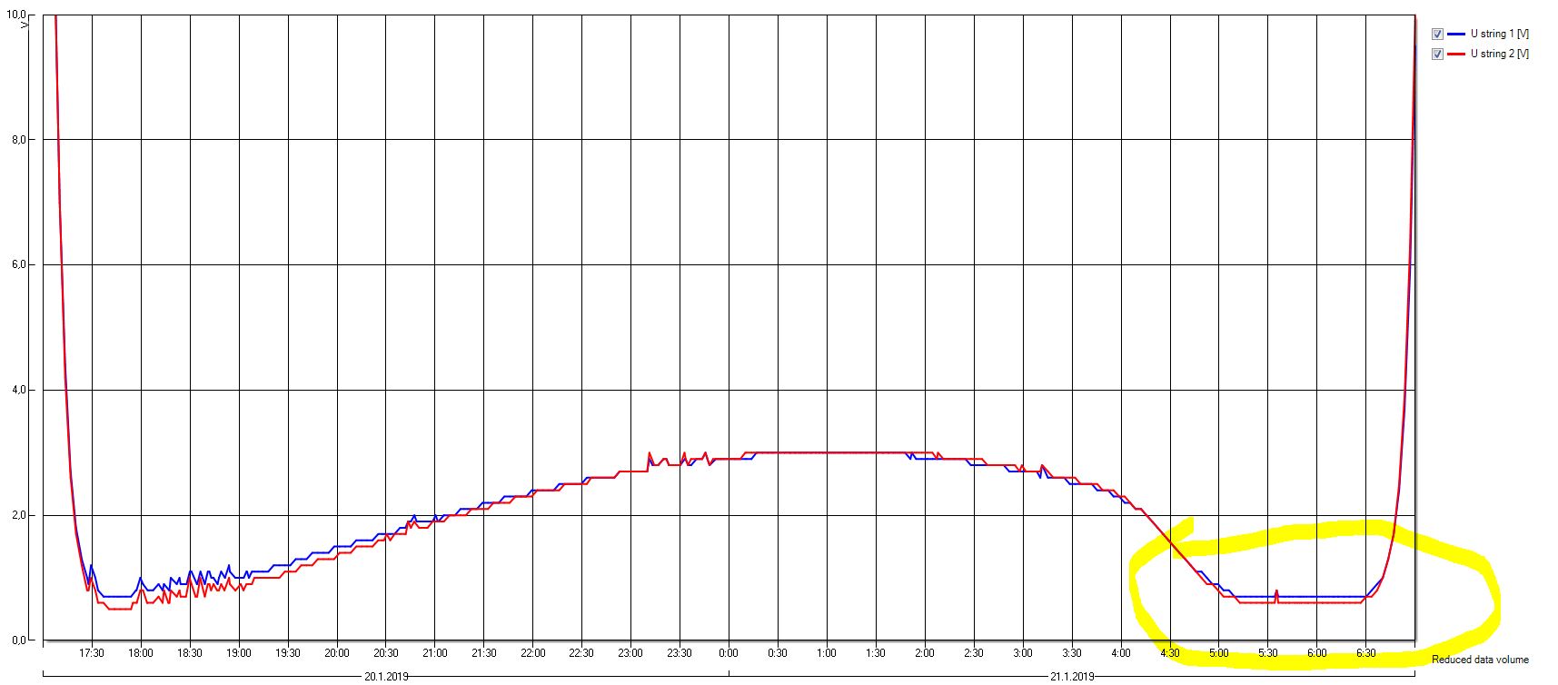 Samozřejmě napětí. Já jsem to dost zvětšil, aby to bylo jasně patrné. Mám tu ještě 18-19.1., to bylo taky jasno, ale k úplňku ještě kousek. Ono je tam vidět, že ráno mám měsíc už trochu z úhlu, ale to zatmění dnes bylo zcela jasné. Uvidíme jak to bude vypadat zítra.dumi píše:Vam.to vyrabi i v noci? Nebo ty grafy jsou jen napeti?