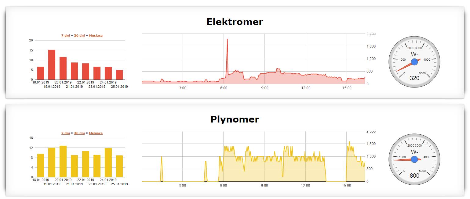 Dáta o spotrebe elektriny cez ESP+podružný elektromer s S0 výstupom. Dáto o plyne cez ESP+magnetický senzor.