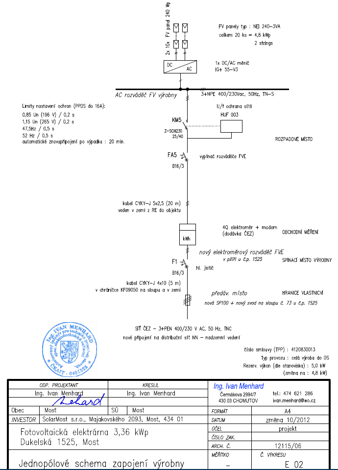 o.t.: Vítej v klubu lidí kteří nevěří nikomu nic. Teď řeším problém s distributorem. Při podávání žádosti chtěli jednopólové schéma. Bez něho ani ránu - žádost obratem odmítnou. Pošleš novou včetně jednopólového schématu. Potom Ti pošlou smlouvu, Ty ji podepíšeš, dostaneš ji z5 podepsanou od nich. Postavíš. Oni po roce od toho kdy jejich člověk o5 zaplomboval elektroměr zašlou výhružku že jsi jim nedodal revizi atd..... Tak jim to zašleš. Obratem Ti dají vědět že jednopólové schéma je špatně a že máš dodat nové a ještě že Ti tam chybí blablabla. Fakt si prosazují ty svý čezácký montovače. Nas.at a odpojit se. Co nejdřív.