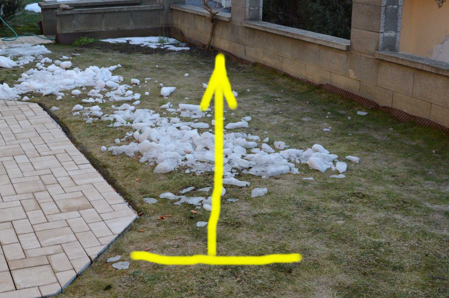 Toto je tá troška starého snehu, ktorá mohla vylepšovať výkon panela odrazom : Naznačená je hrana panela a smer k slnku. Ktovie, možno som to podcenil a ovplyvnilo to výsledok viac, ako sa zdá.