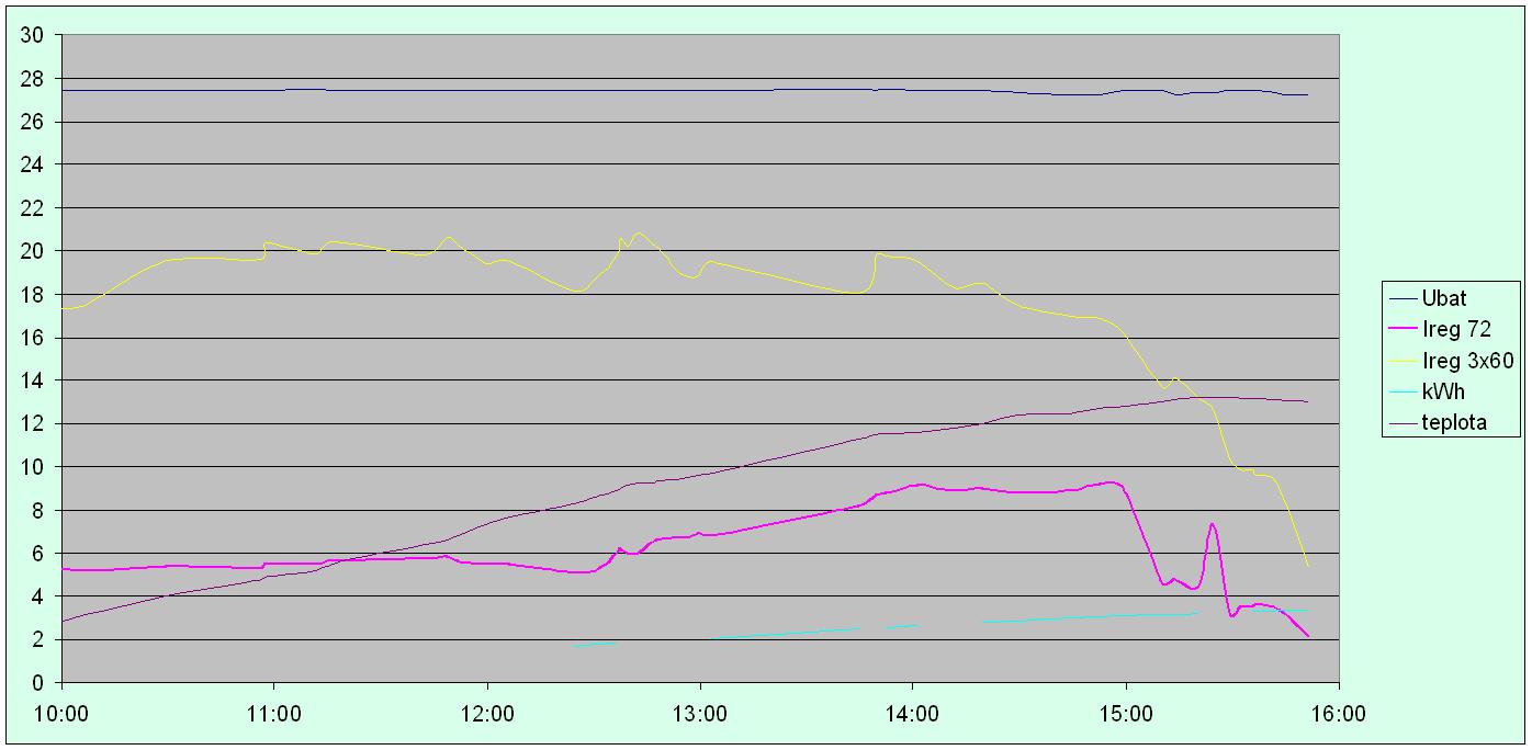 Urobil som dnes druhé meranie prúdu z mppt regulátora, panel 180 Wp a porovnal s priebehom prúdu z troch panelov na pwm regulátore. Panely na pwm sú orientované južne ( 188 ° ) so sklonom 59 ° a skúšaný panel som otáčal dôsledne za slnkom. Porovnaním je vidieť, že okolo obeda neboli výkony špičkové kvôli oblačnosti. Poobede medzi 14. a 15. hodinou bola oblačnosť slabšia, prikladám foto. V tomto čase mono 180 Wp " zabral " a dával cez 9 A z regulátora do napätia 27,3 V. Výkon bol teda takmer ako včerajší, teda 9 x 27,3 = 245,7 W. To je + 36,5 % k nominálnej hodnote panela. Opakujem, je to výkon za mppt regulátorom k nominálnej hodnote panela.