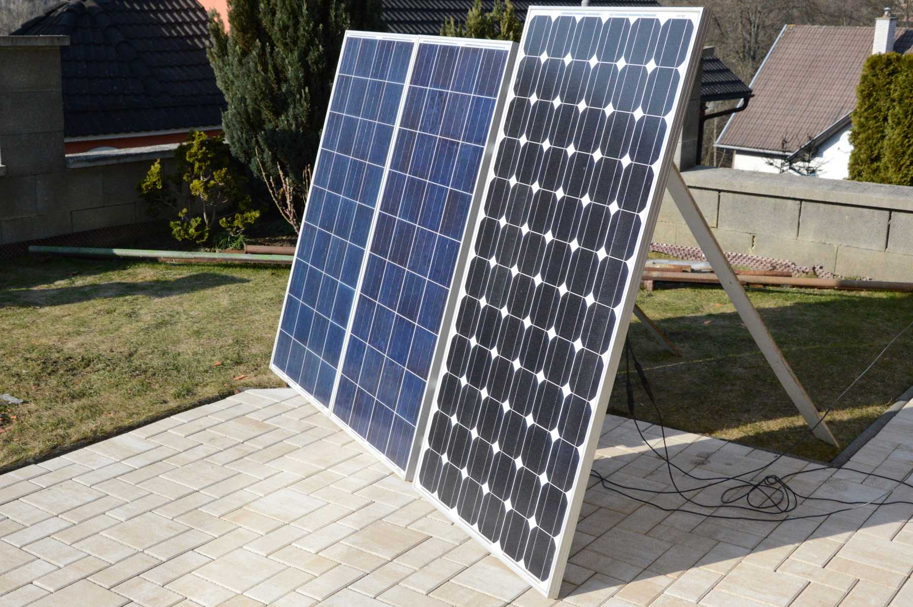 Musím s hanbou uviesť veci na pravú mieru. Tešil som sa z pozitívneho nálezu, že mám výnimočne vydarený panel, ktorý predstihuje všetky obvyklé údaje. Napadlo ma porovnať tento 72 článkový panel s dvomi polykryštalickými 36 článkovými panelmi, ktoré na sezónu skladám dolu zo strechy campera, nech netrpia pod snehom celú zimu. Postavil som ich k sebe do rovnakej pozície a chcel som ich porovnať. Tu som zbadal strašnú pravdu - chýbali mi dve šnúry pri odpínačoch. Nebolo čím odpínať ich jednotlivo. Všetky pokusy, ktoré som robil s tak nádejným panelom, boli urobené aj s pripojenými 2 x 140 Wp poly. Ich paralelné spojenie som spáchal nie pri paneloch ani pri poistkách, ale na trase. Takže meral som všetky panely spolu, len tie 2 poly stáli nenápadne opreté o západnú fasádu chalupy.