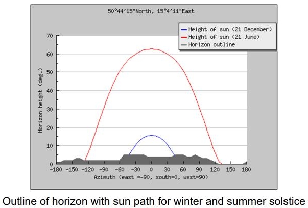 Tak sa na to pozrime detailne. Predpokladajme orientáciu južnej fasády na JJV a z toho východnej strechy na SVV a západnej strechy na JZZ. Z dostupných informácií o polohe môžeme bez udania upresňujúcich parametrov predpokladať takýto horizont : Ideálne umiestnenie panelov na domku by bola bezosporu južná fasáda, na ktorej by bolo optimálne umiestniť panely so sklonom 31 °, kedy by sa dosiahol najväčší ročný zisk z 1000 Wp. Zisk je detailovaný aj po mesiacoch : V ďalších tabuľkách sú hodnoty mesačných ziskov z panelov v stĺpci Em, ktoré budeme porovnávať : Porovnajte hodnoty a urobte z toho záver, či sa oplatí vo Vašich podmienkach zväčšovať sklon panelov a vyrábať na streche " uši ".
