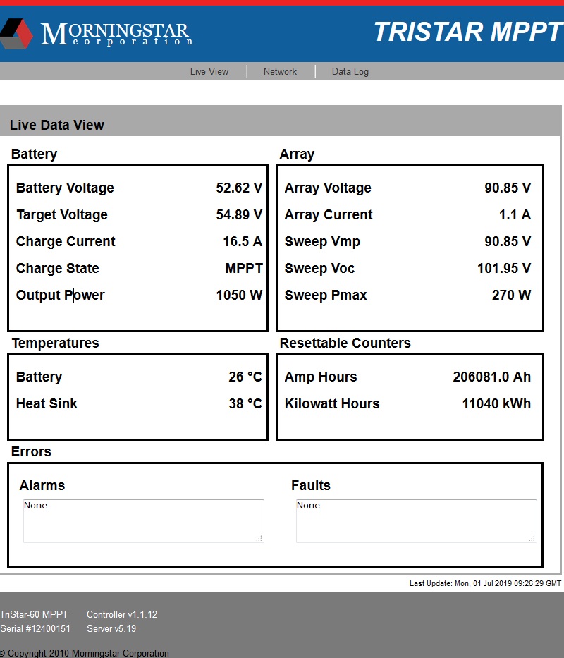 Pravděpodobná prvotní příčina závady je selháhí měření proudu panelů. Tristar mi po cca 11 MWh začal nesprávně nastavovat MPPT. V době, kdy by měl podle oslunění a dle srovnání s výkony ostatních Tristarů dodávat cca 1500W, dodává 1 kW. Napětí na panelech udržuje o cca 15% vyšší než by odpovídalo bodu maximálního výkonu a hodnota proudu panelů změřená Tristarem je cca desetkrát menší oproti skutečnému proudu panelů. Navíc měřené hodnoty vstupního proudu Tristaru vykazují značnou fluktuaci.