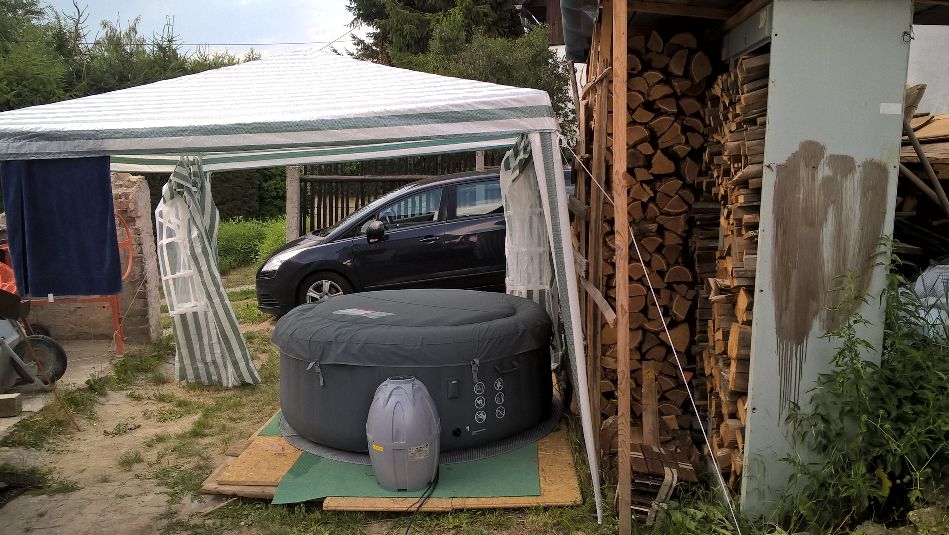 Protože nastaly tropické teploty a je potřeba se zchladit jinak nežli za pomocí vychlazených tekutin, zakoupil a zprovoznil jsem vířivou vanu "Bestway Lay-Z-Spa" mede in China. Zakoupeno přes hobymarket OBI.
