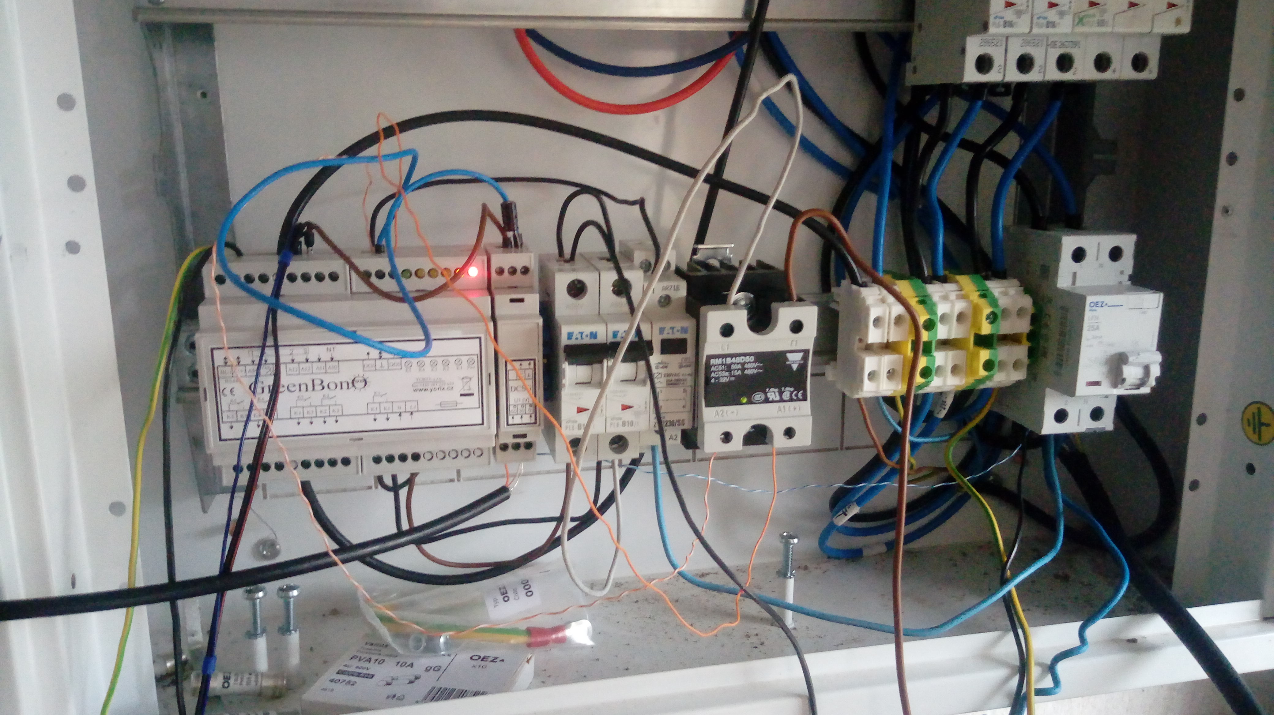 Greenbono 1fazove ovladani nekolika rele na vystupu plus 1x ssr rele. Pripraveno je softwarove reseni pro ovladani vykonu klimatizace 0 az 10V dle prebytku.